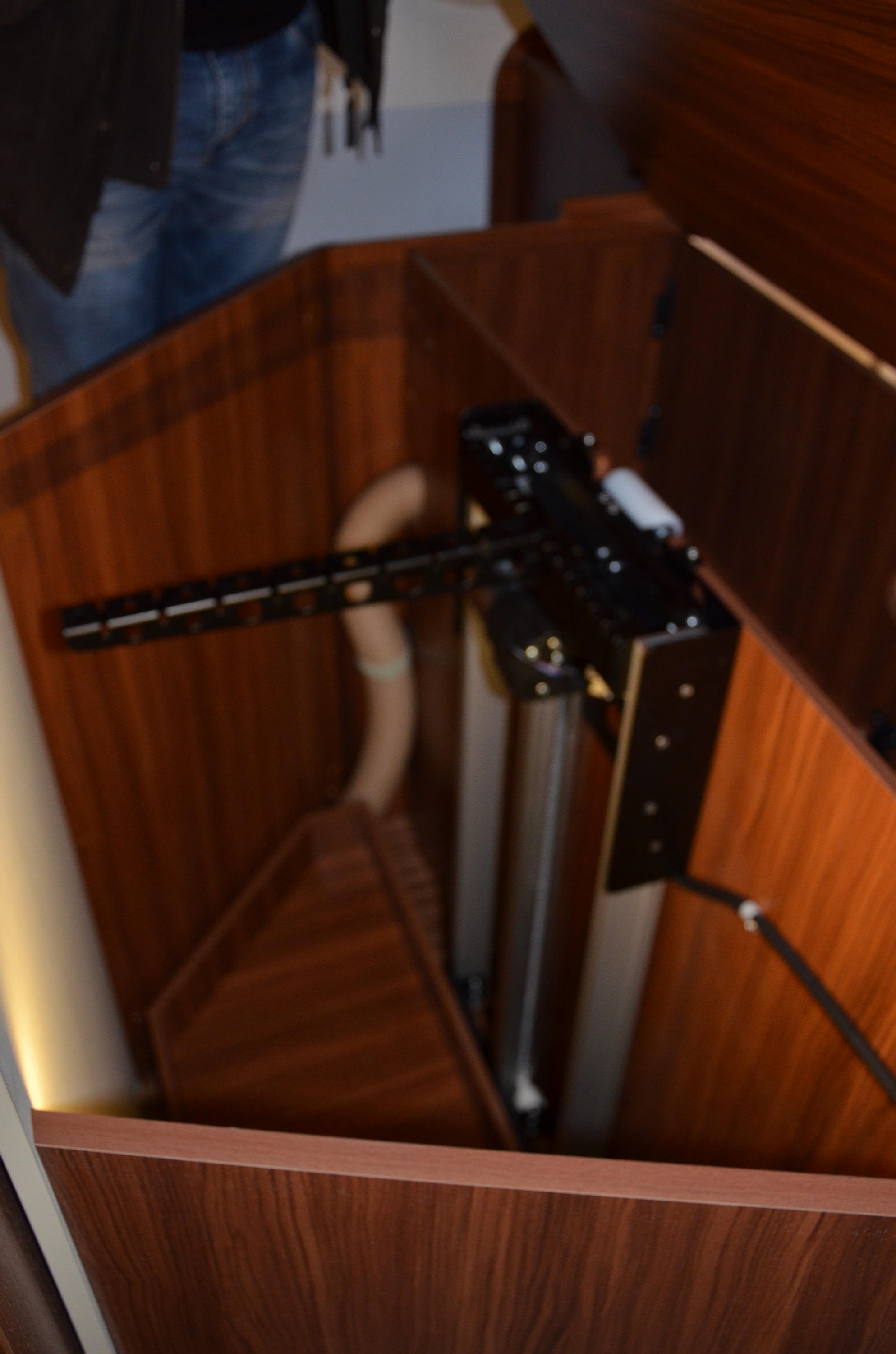Finns en fiffig ”garderob” under sängen som man hissar upp, där man kan hänga galgar