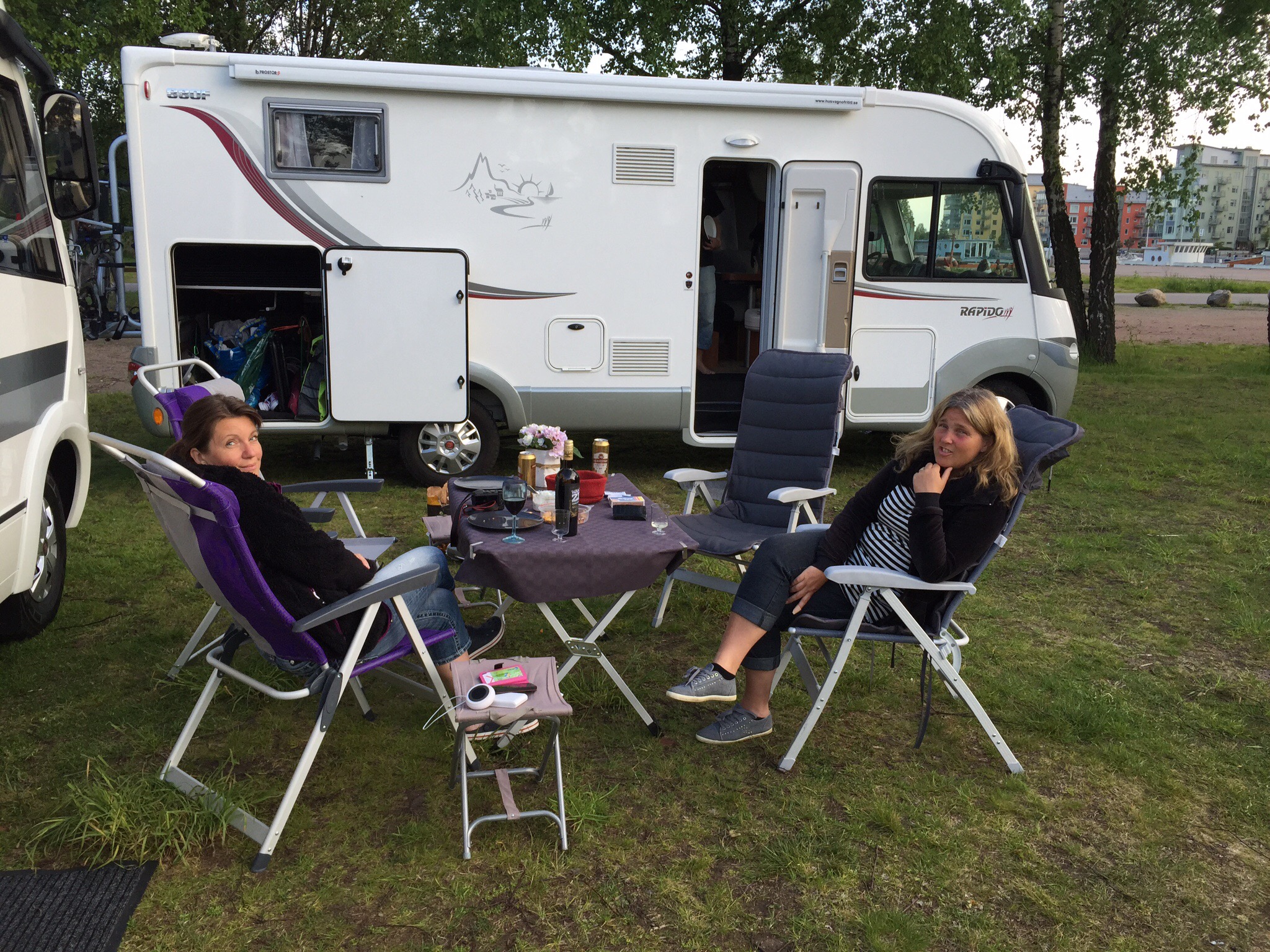 Det behövdes i helgen!! När solen försvann bakom björkarna så vi flyttade bakom husbilen, vid sidan av husbilen och lite framför husbilen… Allt för att sitta i solen utan att bli helt bortblåsta 😄 Grannarna, som varit på ställplatsen tidigare hade tagit den bästa platsen med sol hela dagen, skrattade åt oss 😂