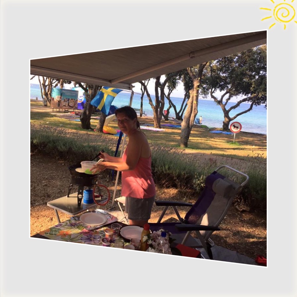 Temperaturen har sjunkit något, och kanske har vi vant oss lite oxå, för nu är det helt okej, 28,8 under markisen, man kan till och med ligga i solen en liten stund 😎 men man måste bada ofta!!!