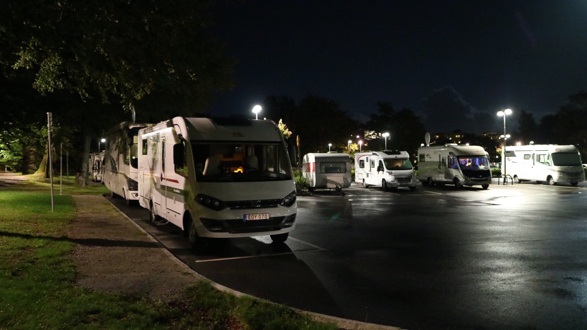 Tolv husbilar står här på parkeringen vid Nolhaga parken. Vi har ingen koll alls på hur här ser ur, för vi kom hit när det var mörkt