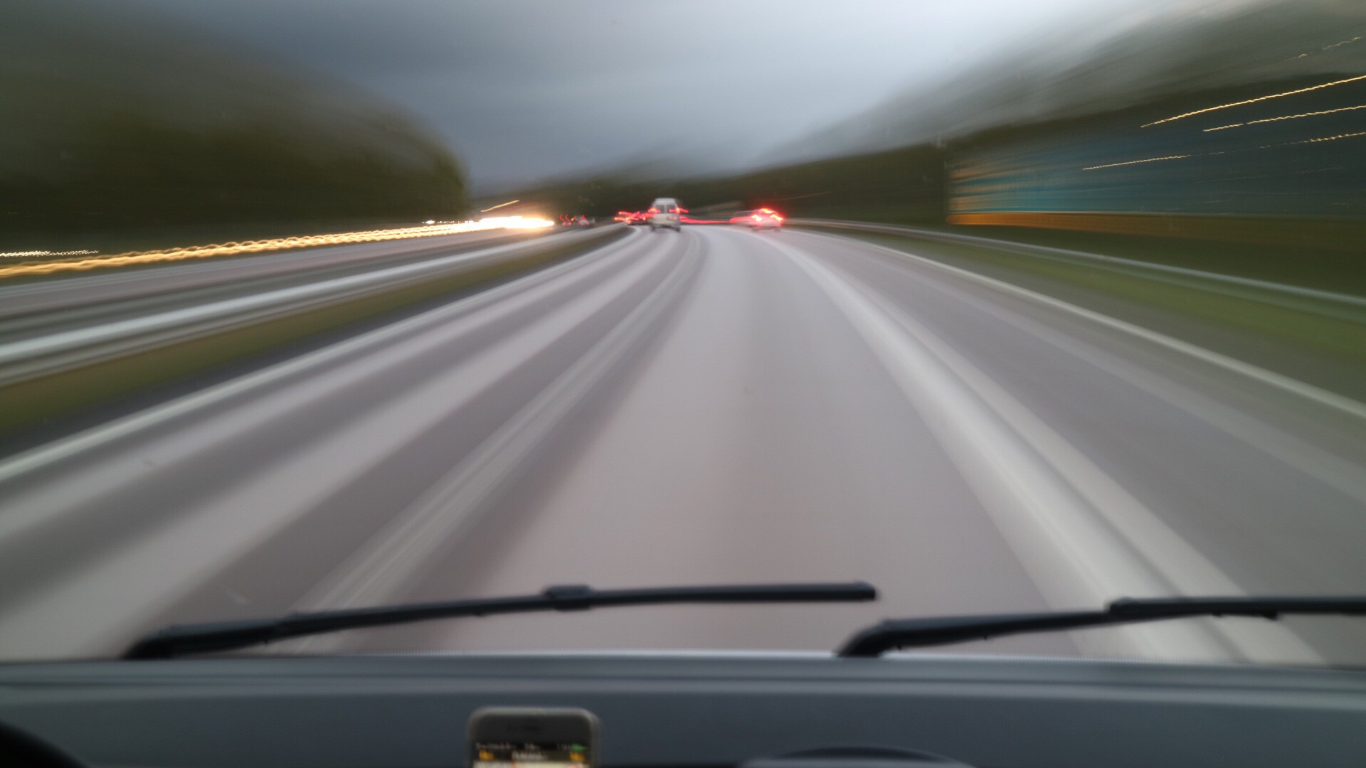På vägen hit roade jag mig med att testa att fota lite med lång slutartid (trafiken då alltså). Ställde upp kameran på stativ mellan stolarna, för lång slutartid utan stativ, blir inget bra!
