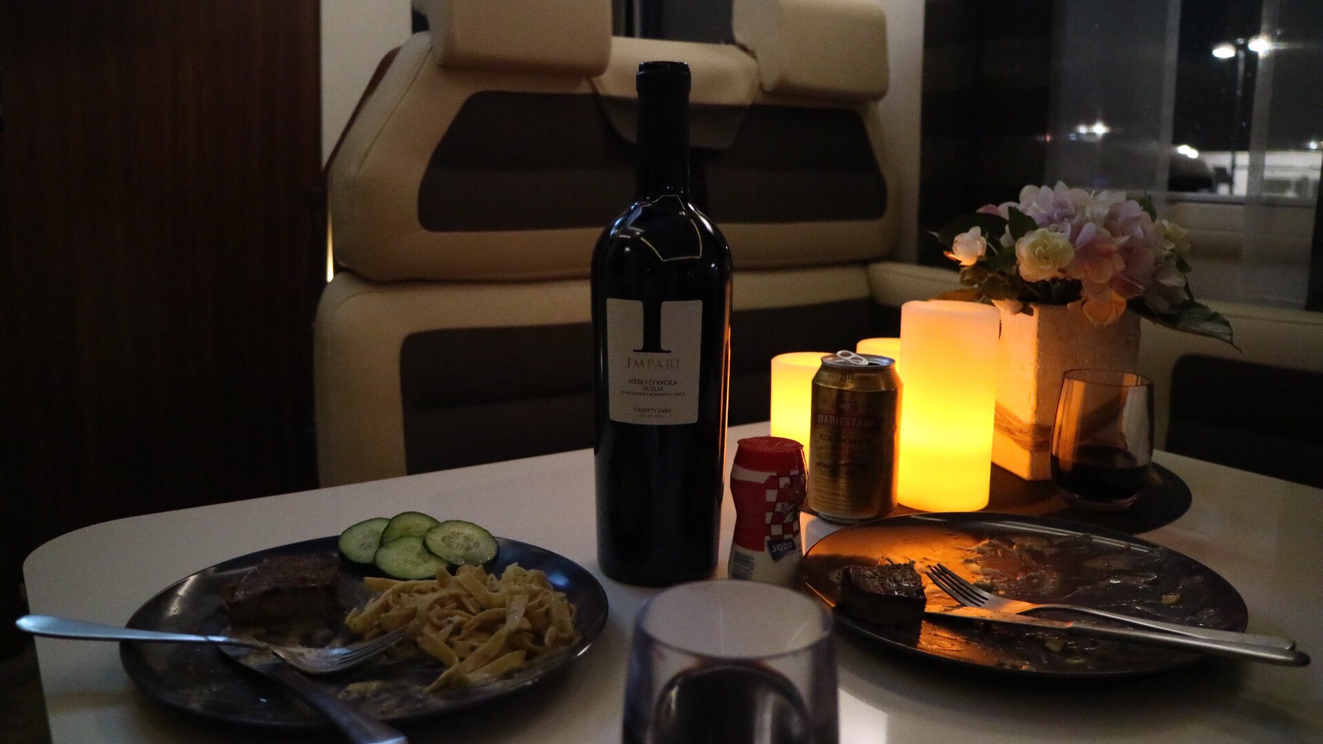 Väl framme (halv åtta) var vi hungriga! Brassade ihop lite mat snabbt och lätt, tillsammans med ett gott vin, Impari, som vi fått rekommenderat av ett par husbilsvänner (det var – är! – väldigt gott)