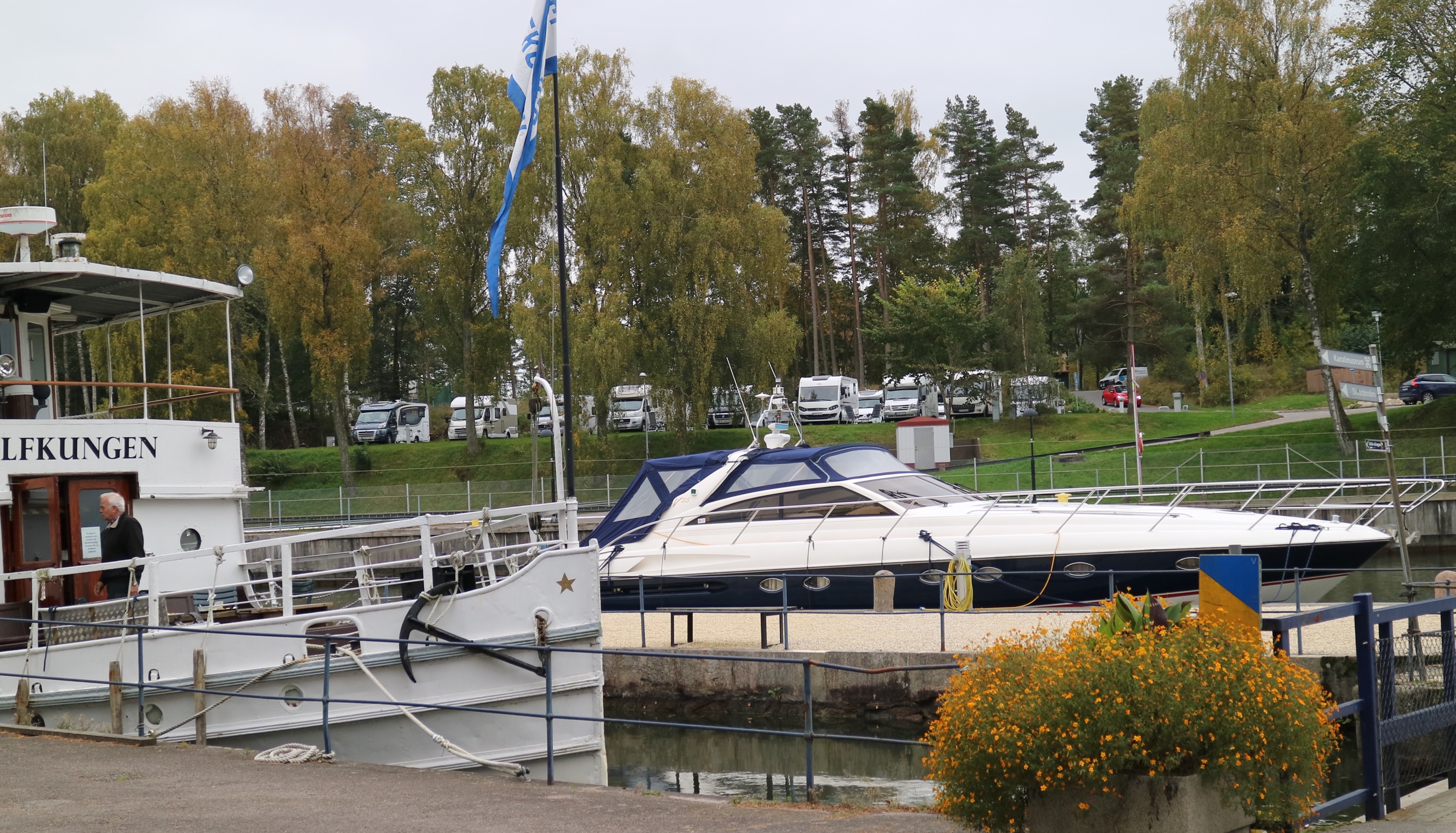 Tillbaka vid husbilen igen kom ett stort fartyg genom slussarna. Vår husbilsgranne som kommer från Trollhättan berättade att fartygen som går här, är byggda så att de precis kommer igenom kanalen och slussen. Man kan väl säga som så, att marginalen inte var särskilt stor!!