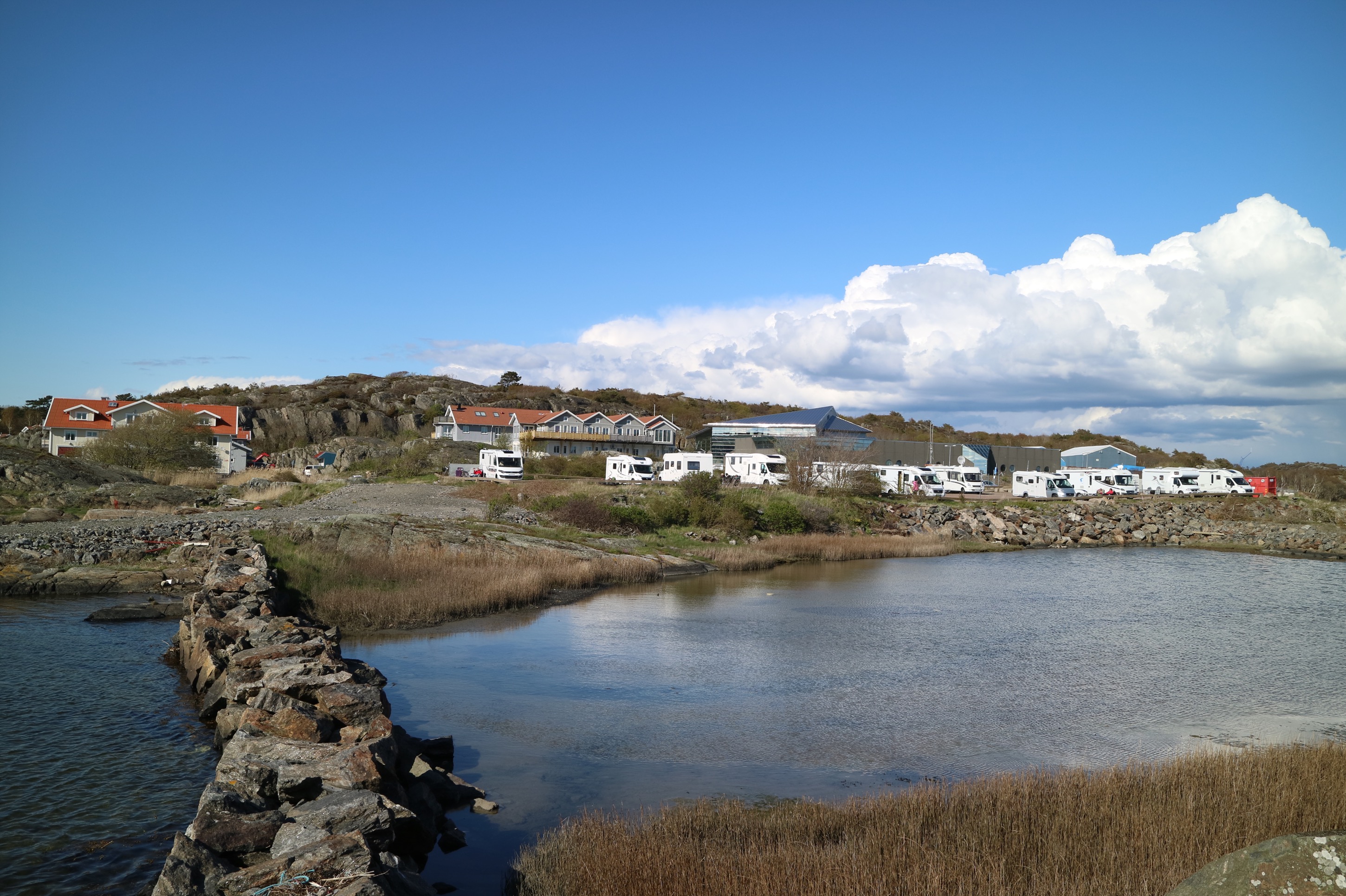 Hade här bara funnits lite ”service” så hade den blivit en överlägsen vinnare, för här finns det vi vill ha! Härlig utsikt! Man cyklar fem minuter ner till färjan, som tar en över till Marstrandsön. Där det finns flera mysiga affärer och restauranger. Båtarna åker kors och tvärs, både små och stoooooora lyx yatcher. Där finns ett par otroligt vackra vandringsleder i olika ”svårighetsgrad” och längd, och inte långt från ställplatsen finns en fin badplats där man bara kan kasta sig i från klipporna (om det inte varit så förbaskat kallt förstås). Men man kan inte fylla på eller tömma vatten… Enda ”servicen” är en sopcontainer…