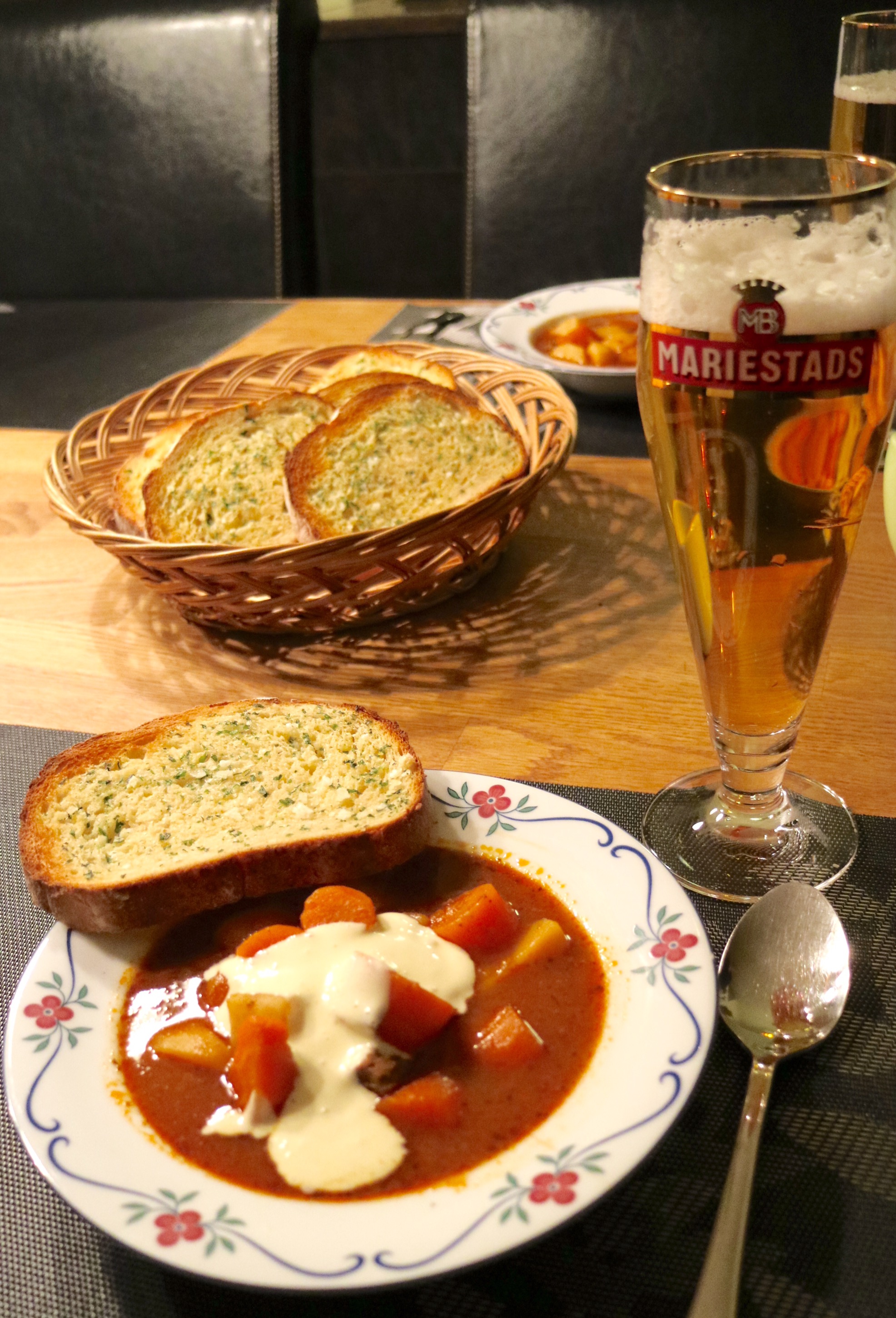 Eftersom jag går ”all-in” när jag gör nått, så kände jag ju att jag måste göra ordentlig ”öl-mat” också. Tyska korvar och schnitzlar är inte riktigt min favoritmat, så det fick bli en hederlig gulasch, och då efter Per Morbergs recept off course!! (men på nötkött istället för vildsvin….), aioli och vitlöksbröd