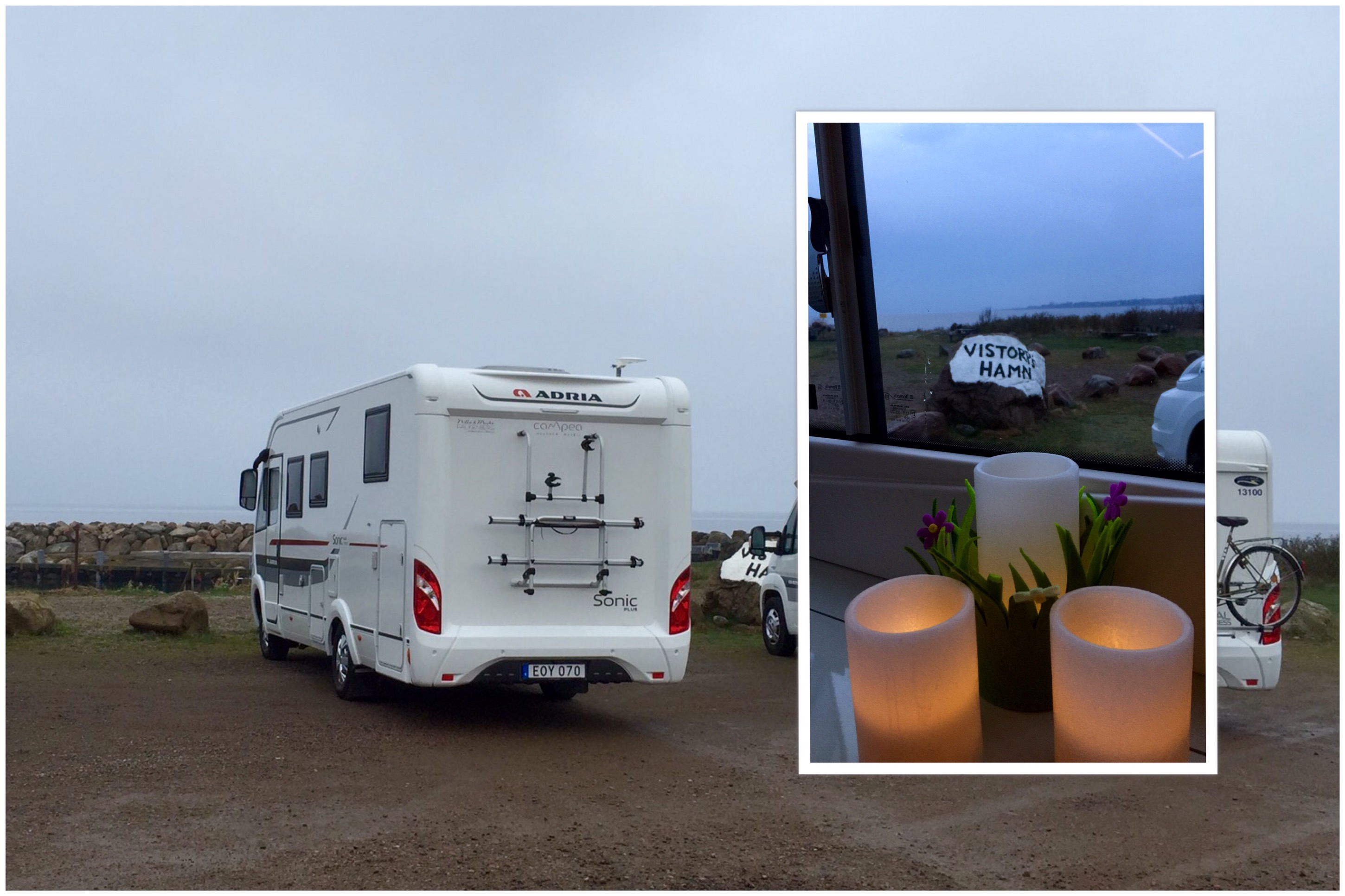 Beslutade oss för att åka till Svanshalls ställplats och ”kolla läget”. Där var fint, men inte en enda husbil! Bestämde oss ändå för att stanna. Efter en liten stund kom två husbilar till, så nu är vi inte ensamma längre 😊