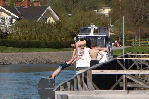Göta kanal öppnade i går, så vi har sett ett par båtar åka förbi – sååå mysigt!!
