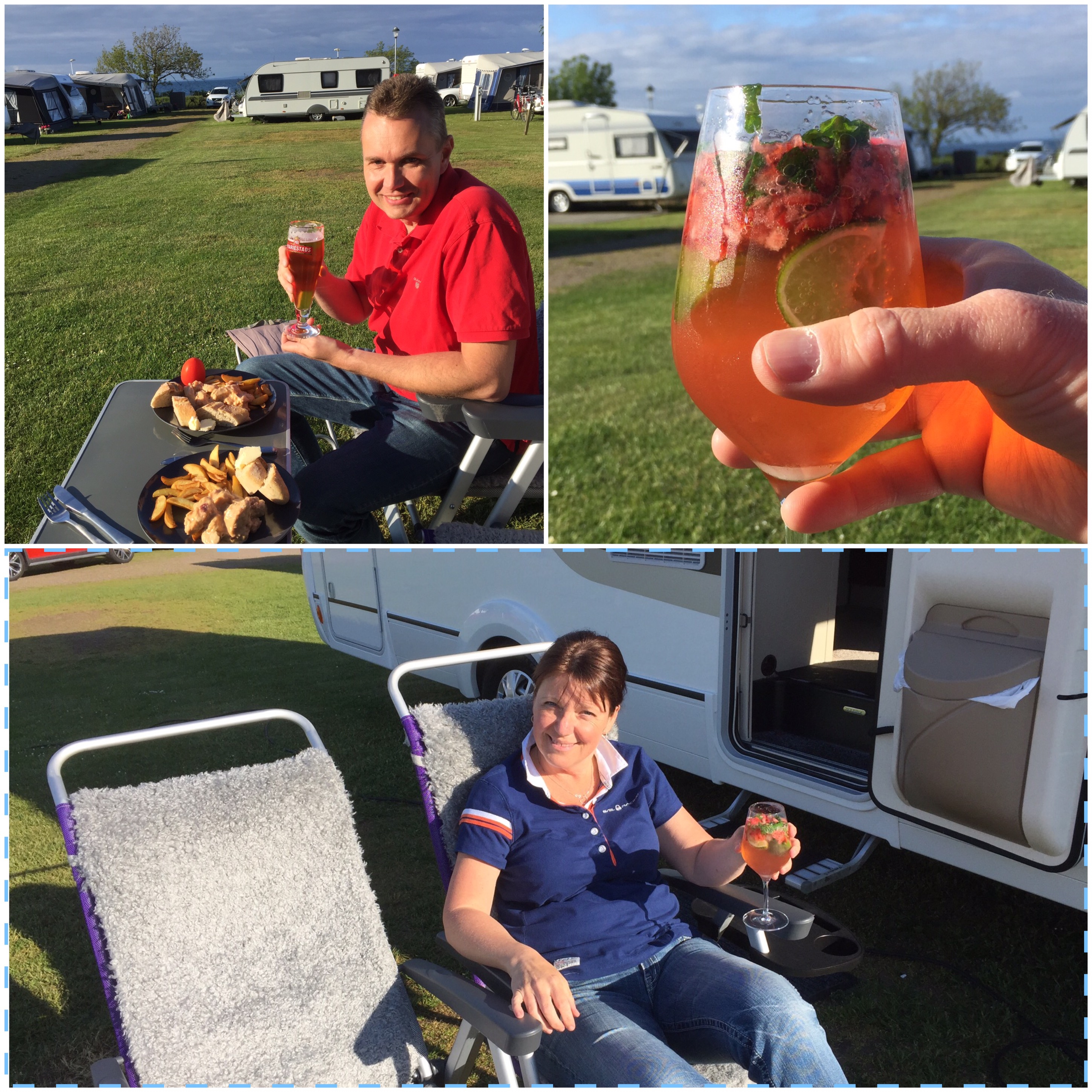 Nu har vi hamnat på Norrvikens camping, vilket verkar vara ett bra val, för solen lyser på en blå himmel och vi har suttit ute och ätit 😊