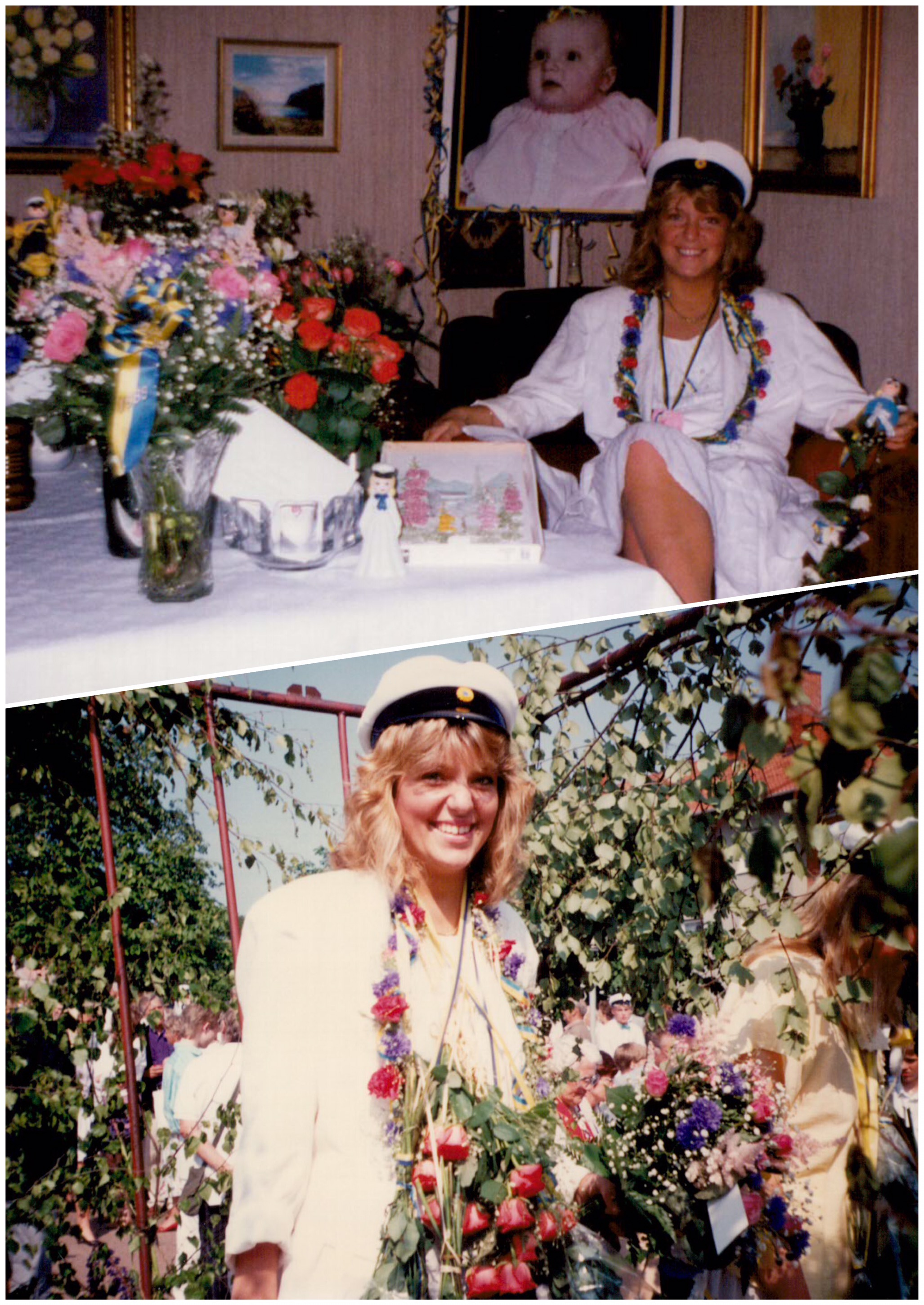 Björkar, ballonger, vimplar, serpentiner och flaggor.