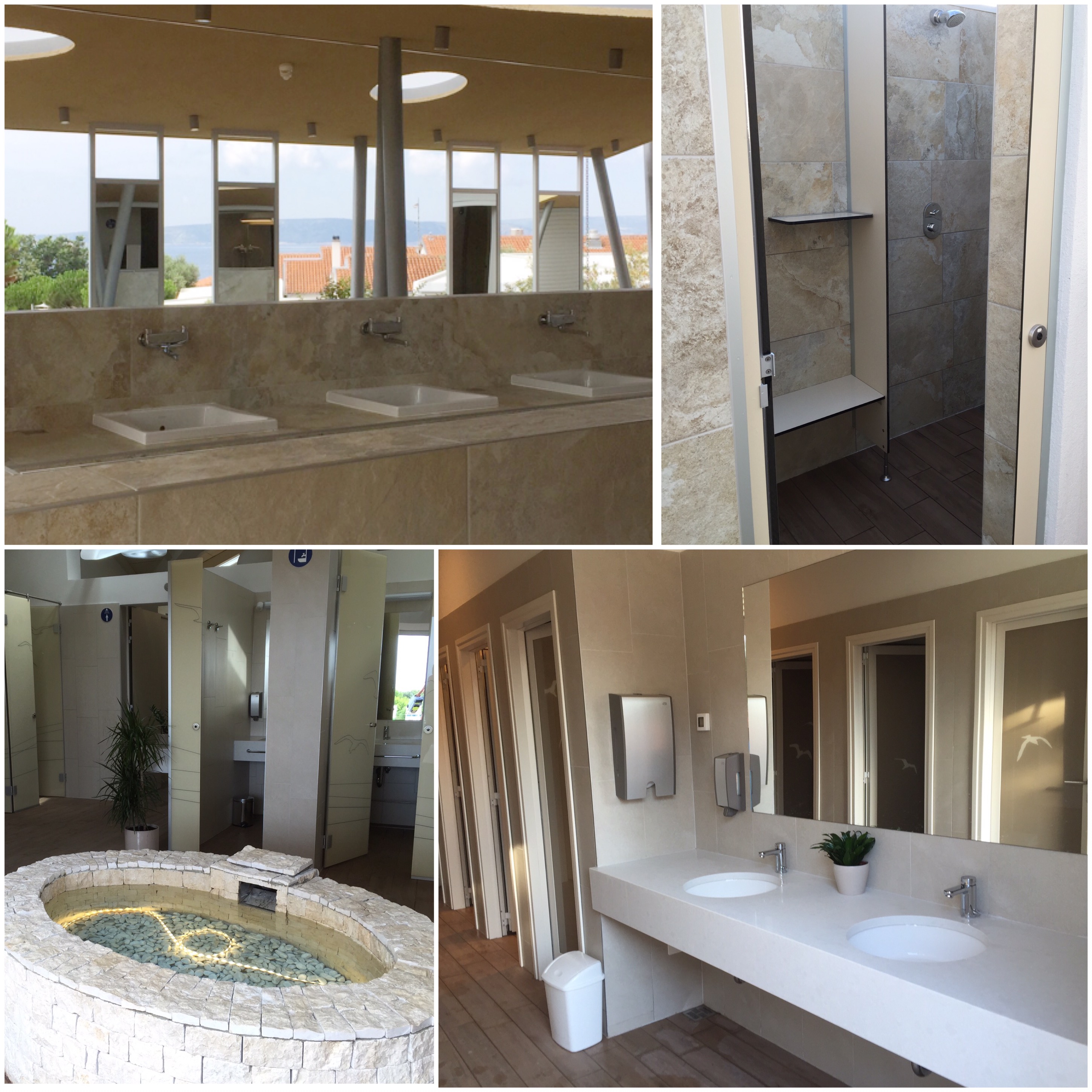 Utlovade ju bilder på toaletterna – alltså stå och diska där, är ju ett rent nöje! Med utsikt över havet 😎 Det finns ”utomhusduschar”, bild två till höger, barnduschar och familjeduschar. De går och städar hela tiden, så det kännas verkligen superfrächt!!