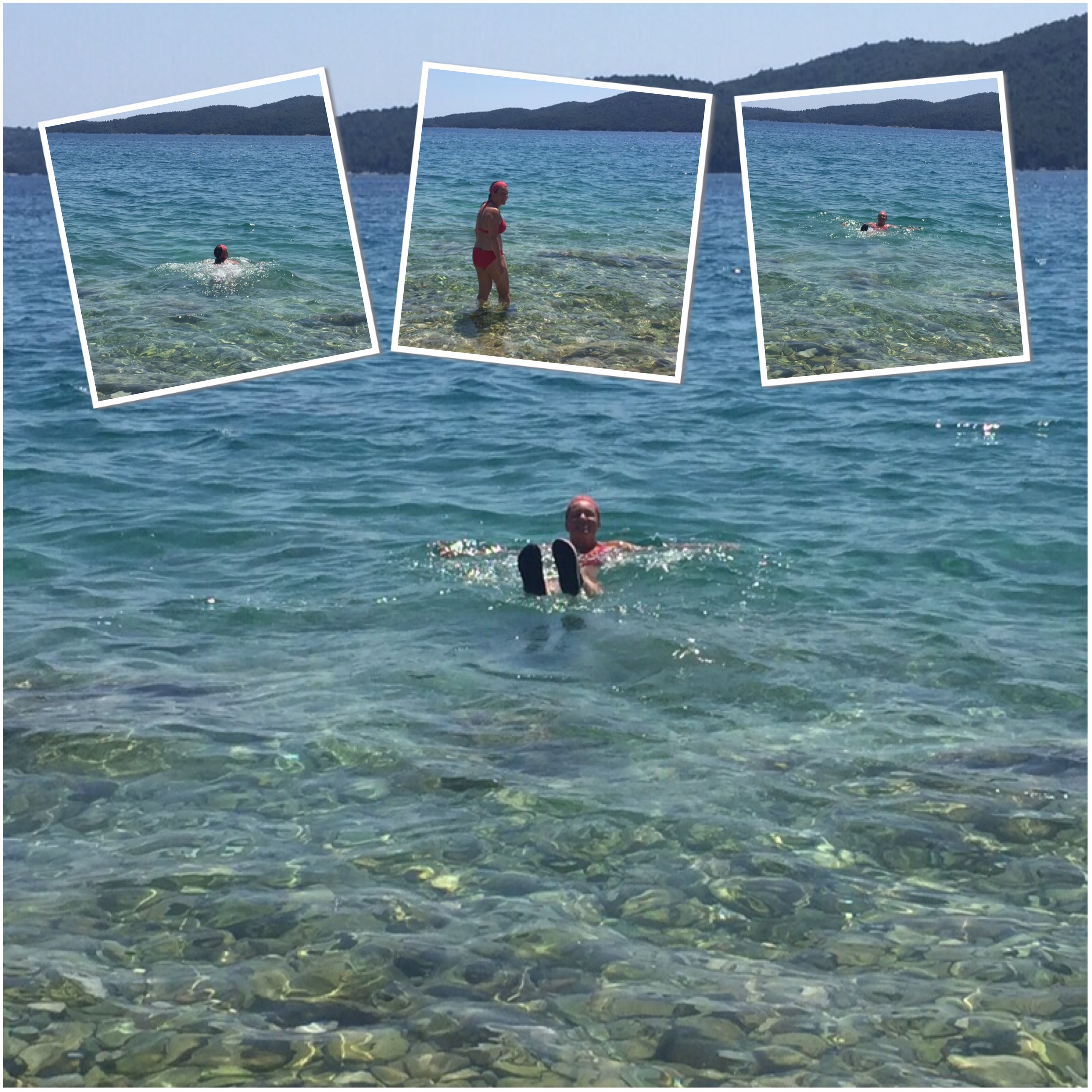 Pooler och uppblåsbara ” vattenleksaker” finns det gott om, men kostar pengar, ja, inte poolen, men vem vill bada i poolen när det finns så fint vatten???? Helt underbart turkost och allra bäst på morgonen!