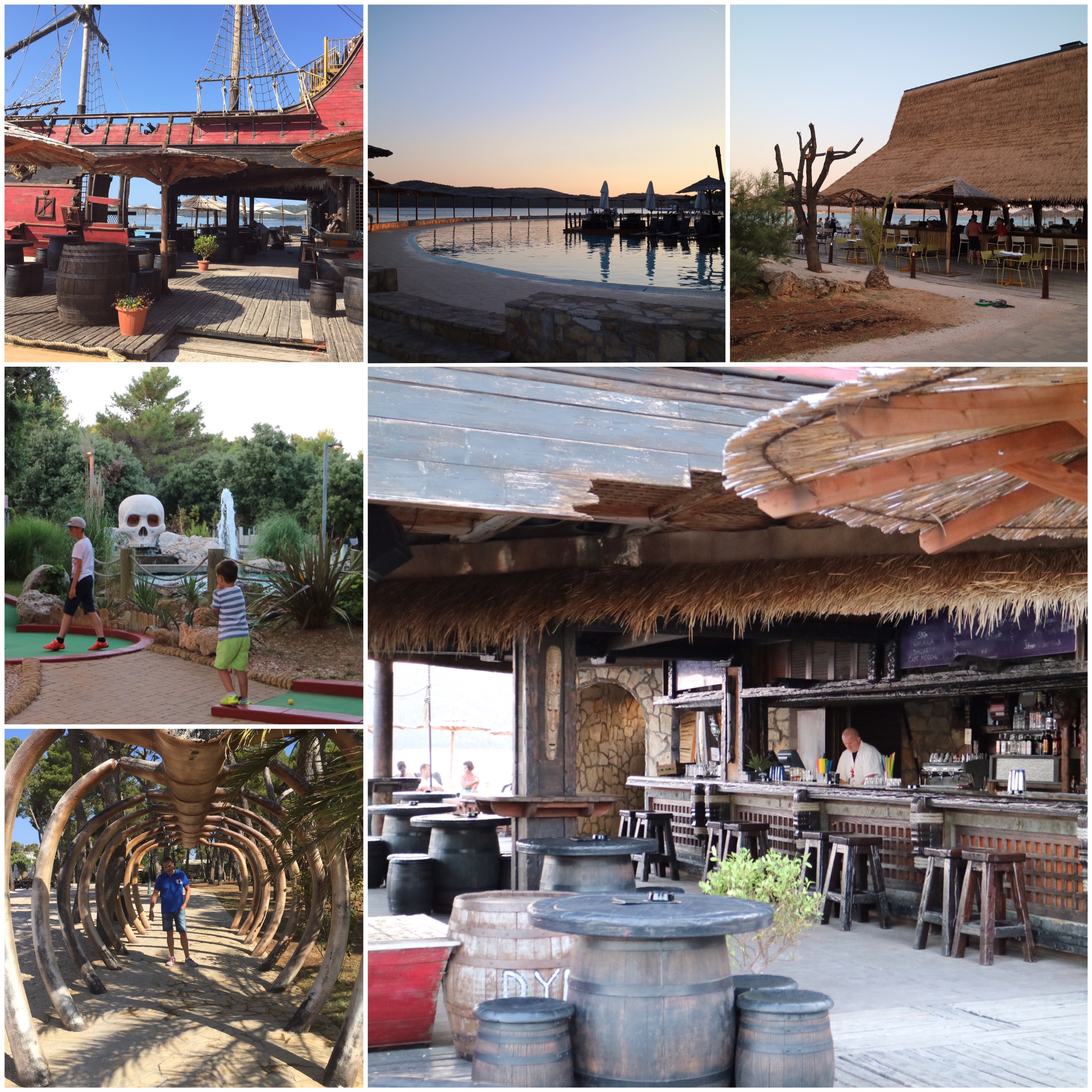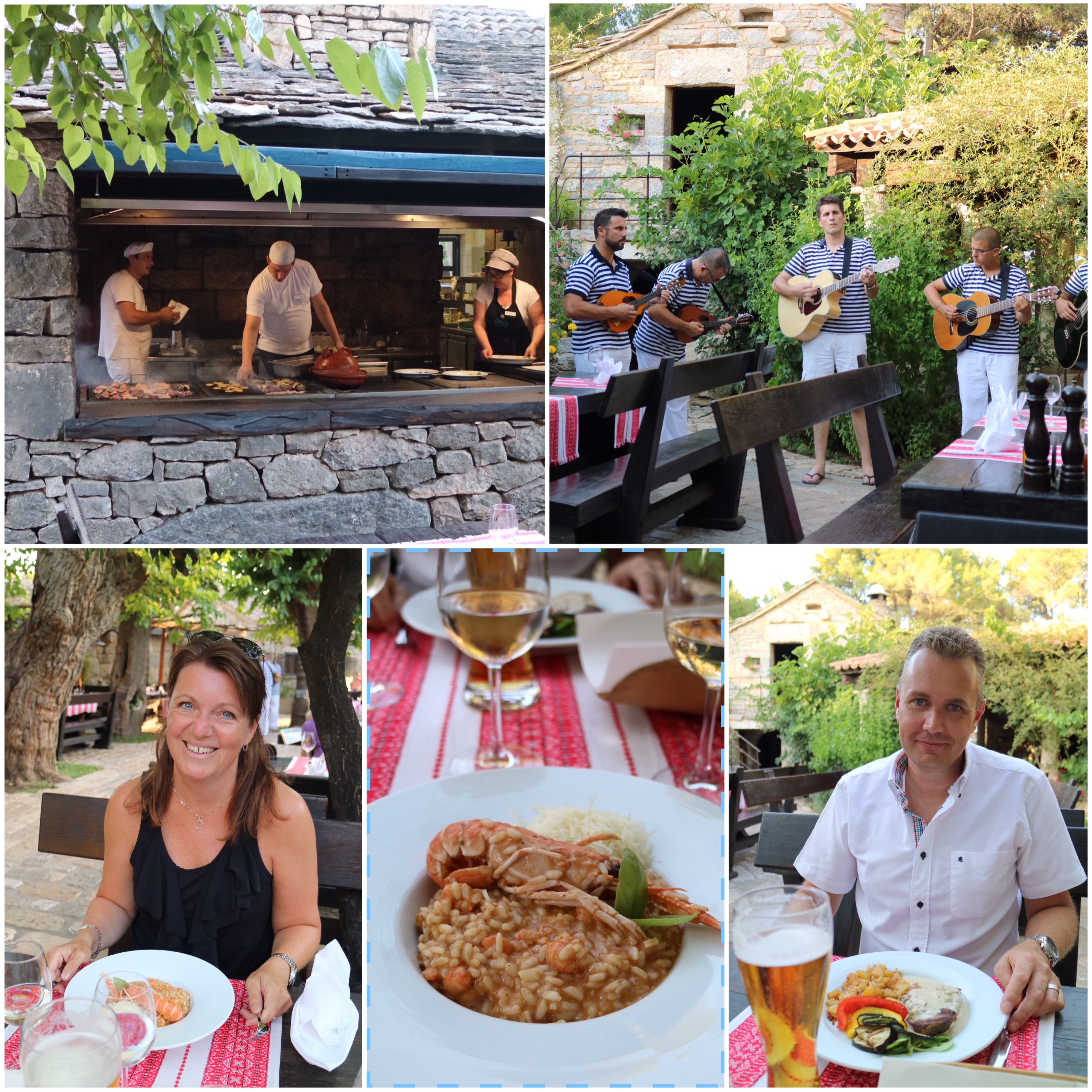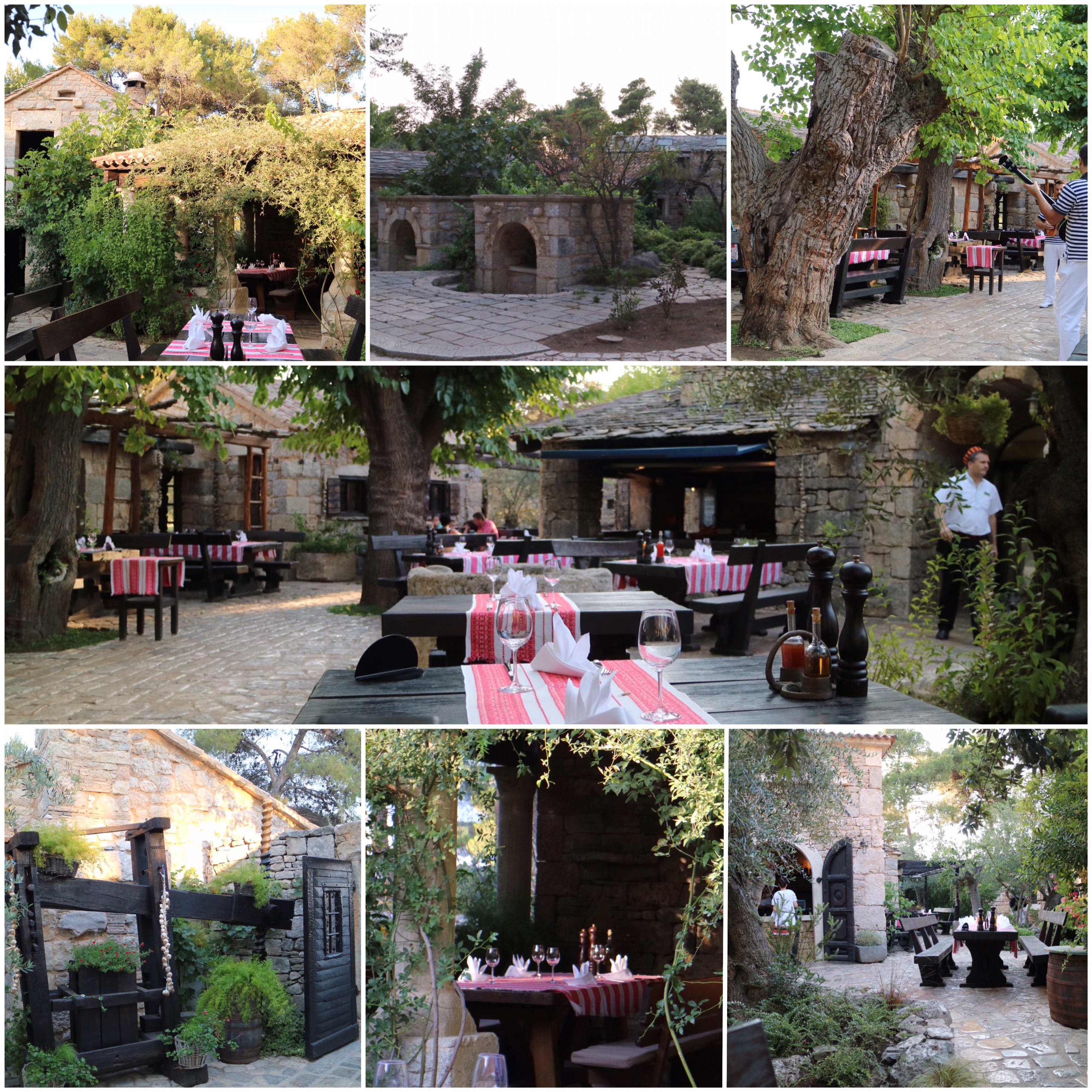 Det finns sex restauranger! På en av dem bokade vi bord ikväll -> mitt inne i en uppbyggd liten dalmatinsk by. Så fint så man inte visste vart man skulle titta helt enkelt! En egen ”vingård” fanns där oxå – mitt i alltihop 😳 Jösses!!! Ja alltså de odlar vindruvor i alla fall 😄
