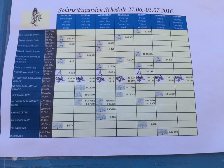 Tre gånger i veckan kör de bland annat till Krka nationalpark (den vi gjorde igår). Annars finns utflykt till Split, Dubrovnik och en massa båtturer och dykning.