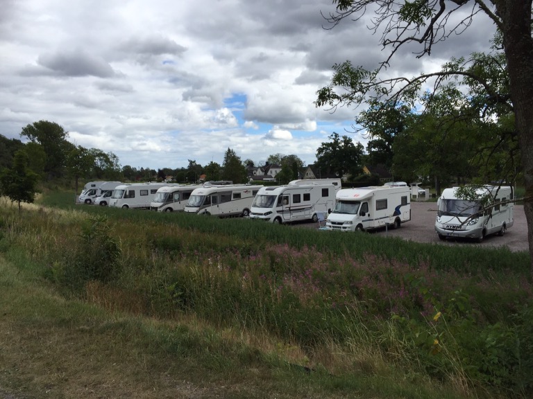 Ställplatsen ligger bara ett par hundra meter från ”centrum”, och har varit full nu ett par timmar, många som fått vända!