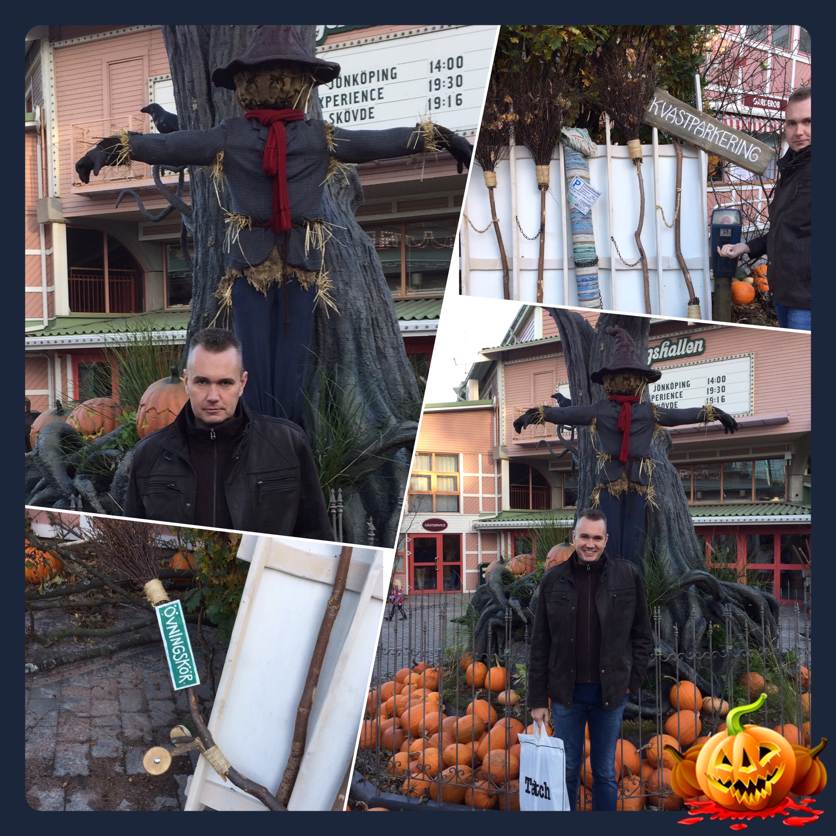 Mikael försökte se läskig ut framför hö-dockan – det gick väl så där 😂. De hade fixat en fin kvastpakering 👍🏻 även för övningskörningskvastar 😄