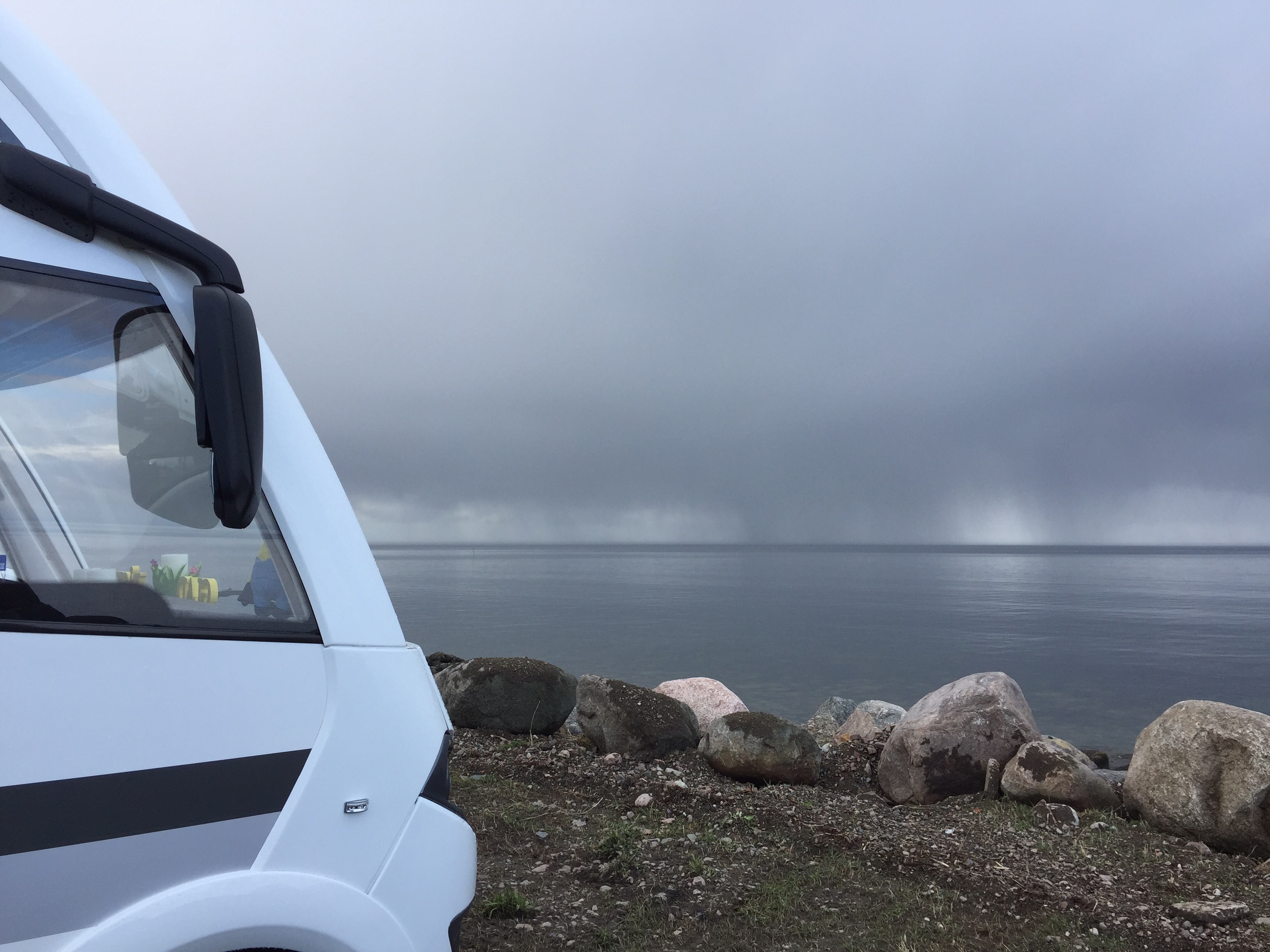 Undra om det kommer hit sa vi….. Det gjorde det!!! Bara till att backa in igen 😕. Efter fem minuter blev det uppehåll igen och vi gjorde ett nytt försök! Tog med Lena och Rogers hundar för en liten promenad.
