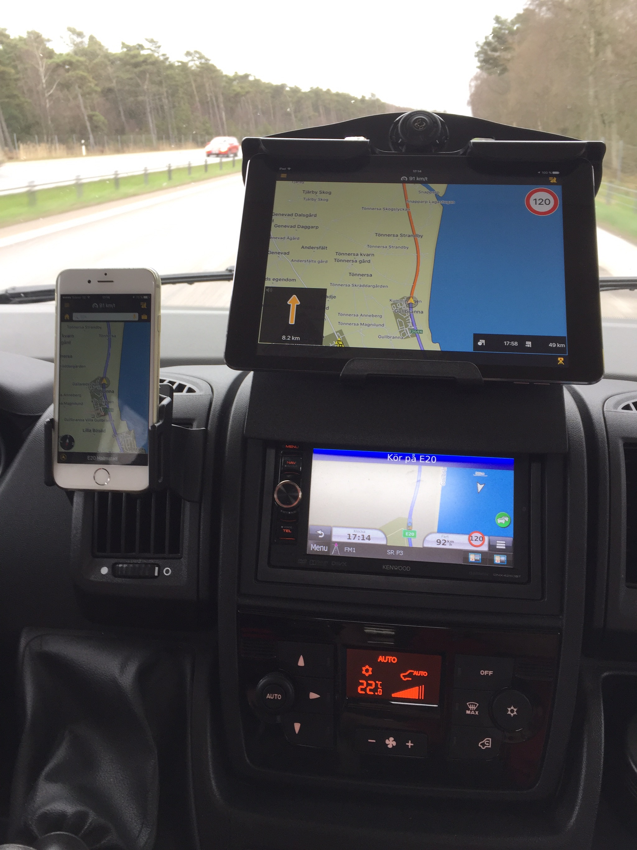 Vi är nämligen inte helt nöjda med navigatorn i bilen, seg som sirap! Det ska gå fort när man zoomar in och ut. Det kan man verkligen säga att vår INTE är! Så han letade upp en hållare för sin Ipad och satt igång Navigon i den i stället – mycket bättre!! Ser ju lite kul ut 😂.