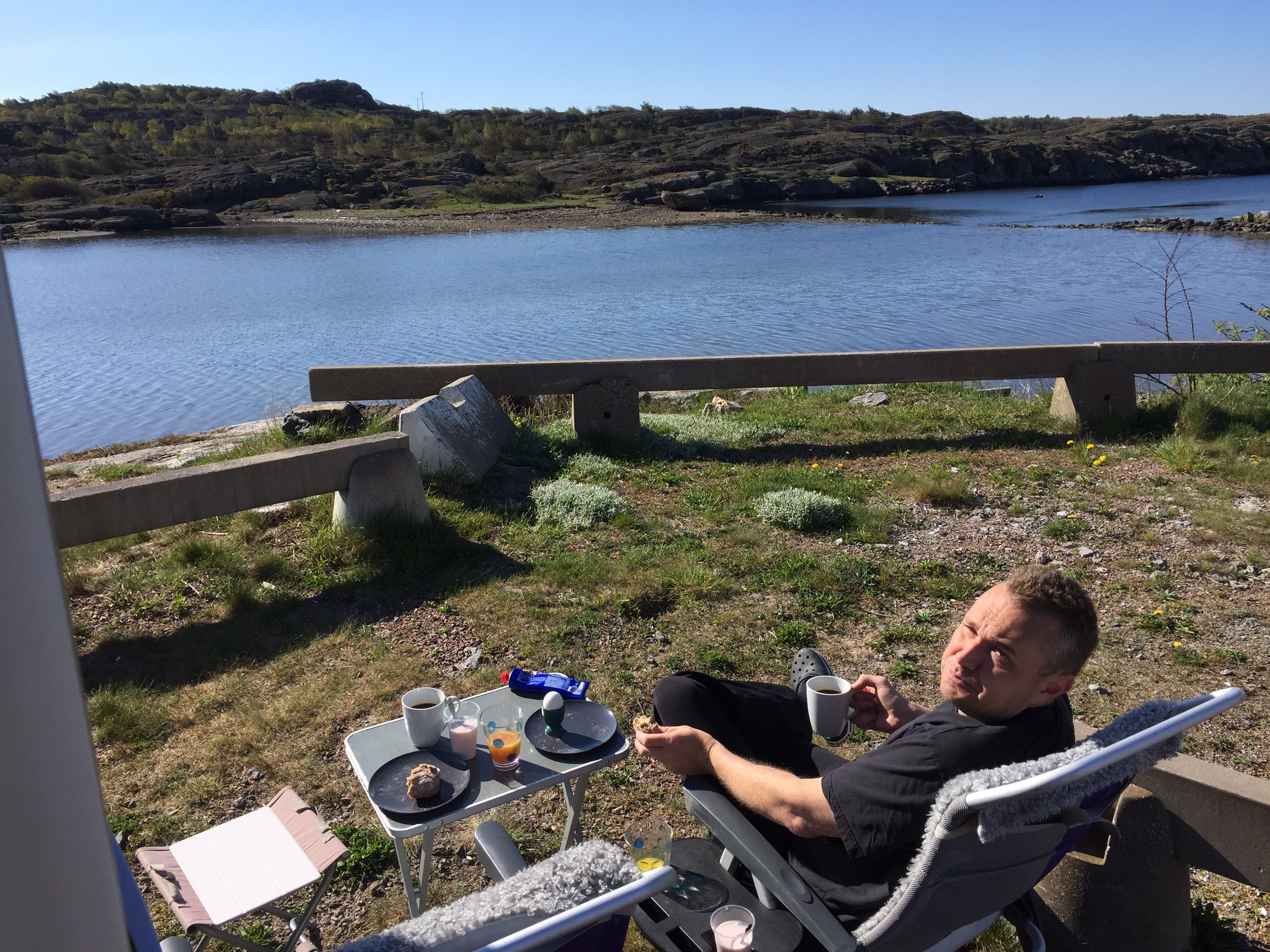 Väl tillbaka vid husbilen efter 6 km (19 våningar enl IPhonen) så serverades en välförtjänt frukost utomhus. Ja alltså jag serverade frukosten…. 😜