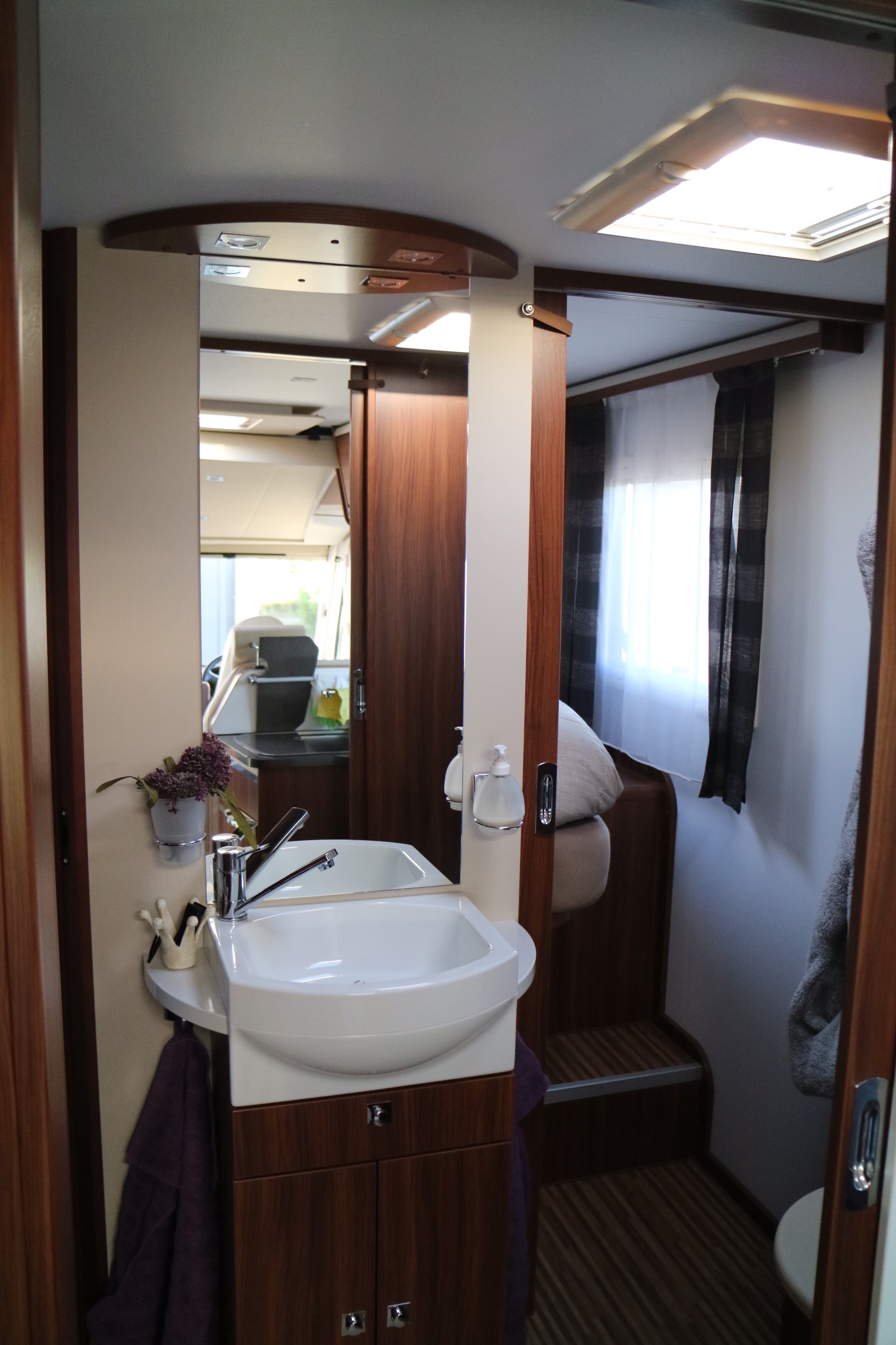 Fördel: man får en jättestor toalett! Nackdel: man kan inte stänga igen toaletten på samma sätt som i en ”vanlig” husbil. Det är i 98 fall av 100 inget problem, förutom när vi är nere i Kroatien! Då får man städa toan typ en gång om dagen!, för i sådan värme luktar det som kan lukta, väldigt mycket mer!!!