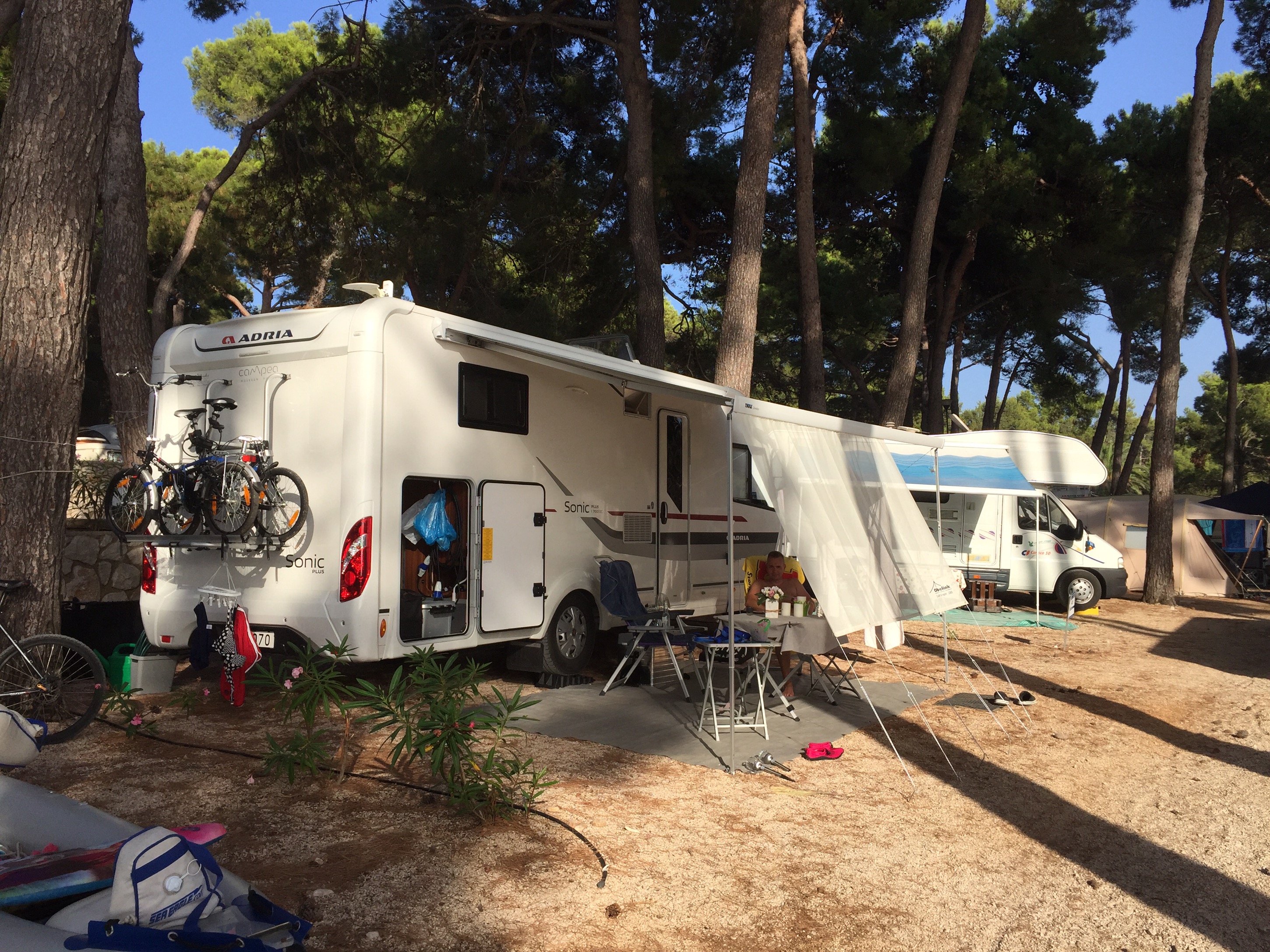 Nu sitter vi lagom matta utanför husbilen och njuter