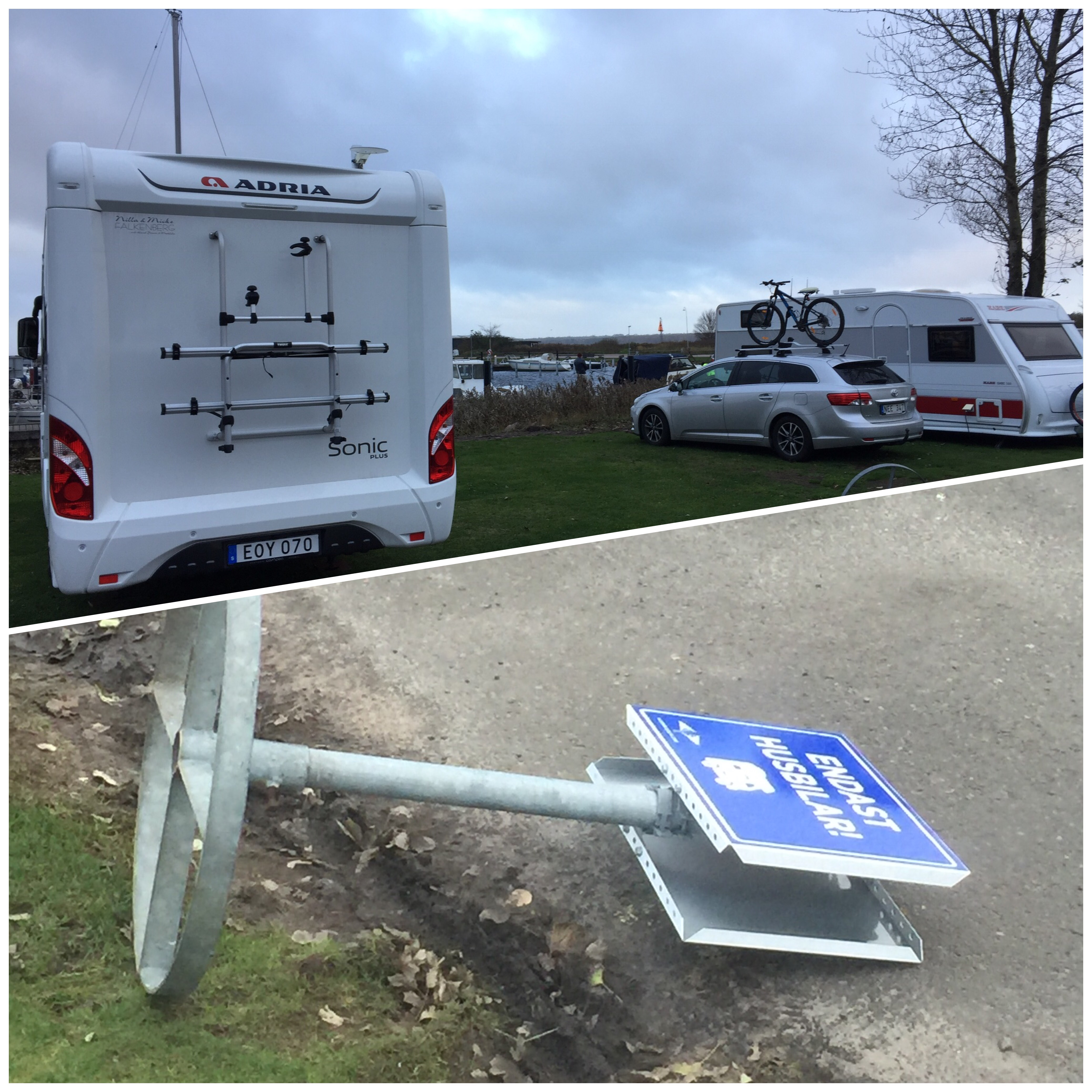 Skylten blåste omkull…. ett tag funderade jag på om även husbilen skulle välta 😣. Jag HATAR blåst!