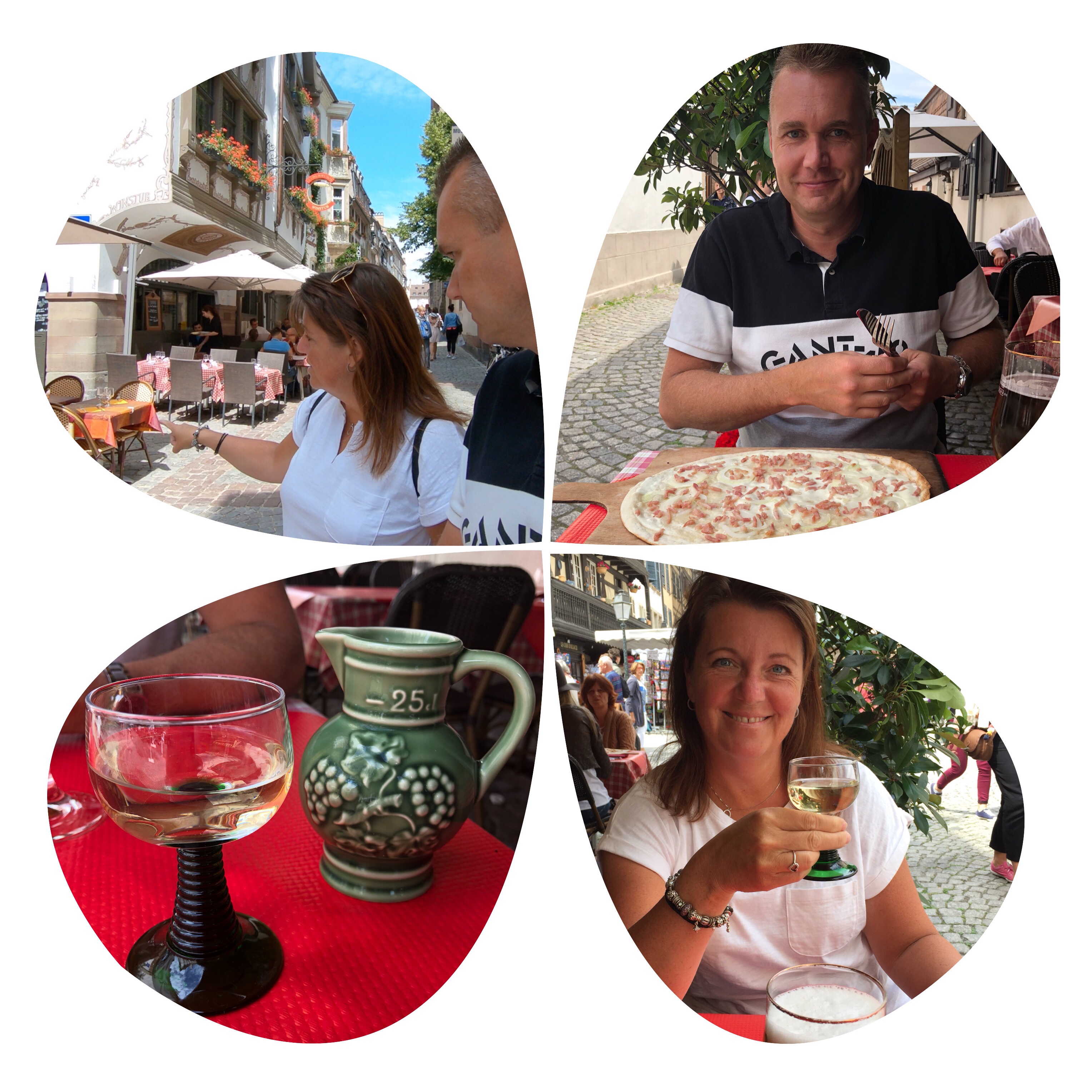 Man blir hungrig av all sightseeing!! Provade på en Alsace specialitet – deras motsvarighet till pizza, Tarte flambeé
