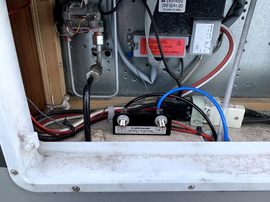 Sen monterade han dit någon liten mojäng där man då ska fylla på luften. Det satte han innanför kylskåpsgallret för att det skulle vara smidigt att komma åt.