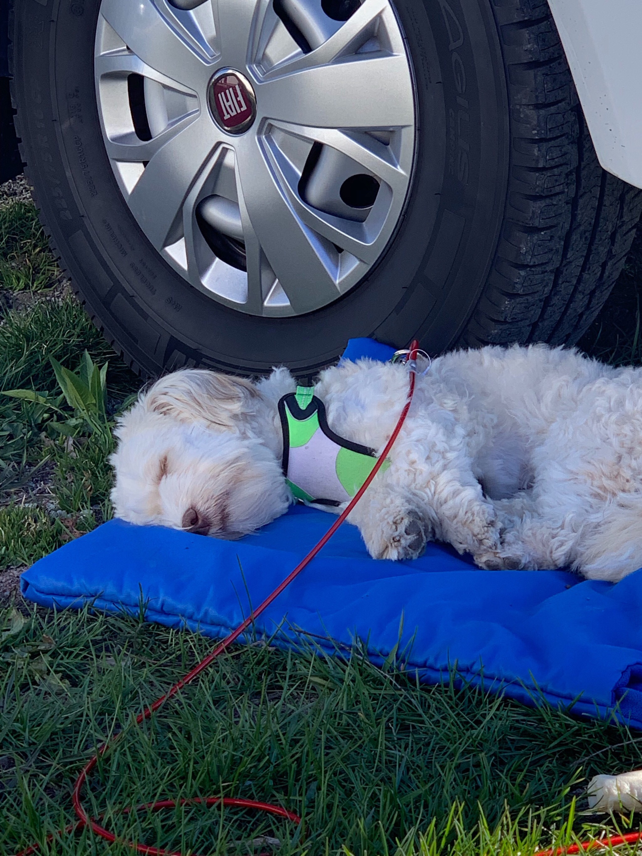 Binkan satt lugnt och stilla i sin cykelkorg – han gillar husbilslivet! Alltid händer det nått!!! Men man blir trött🤣