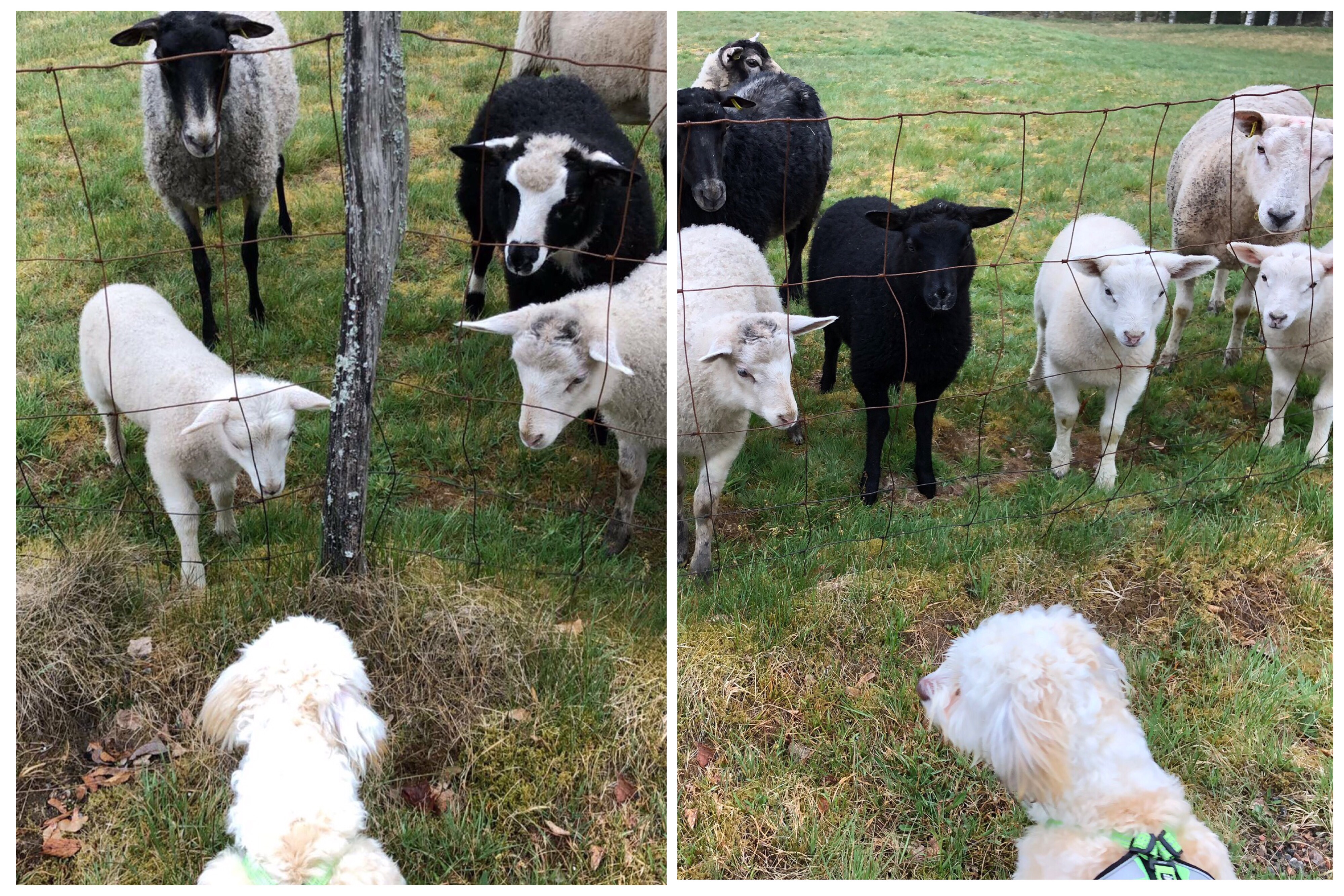 Alla fåren sprang fram till honom och de stod och tittade på varandra, nosade lite, sen fick vi bokstavligen dra honom därifrån. Han tyckte nog det var konstiga hundar, och de tyckte nog han var ett konstigt får 😂😂😂