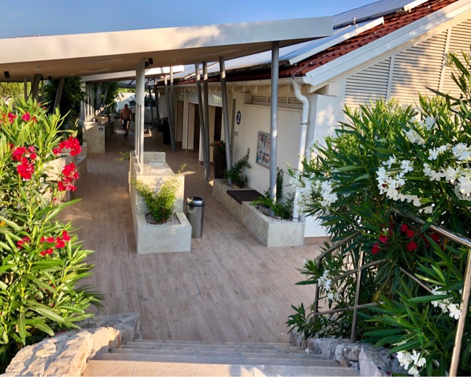 Där är riktigt najs att ligga, men förbjudet för hund 😢. I kanten finns en massage ”hydda”, där jag i förmiddags bokat in en fotmassage – såååååå gott!!! 🥰 Imorgon ska både jag och Micke ha var sin rygg och nackmassage 😜.