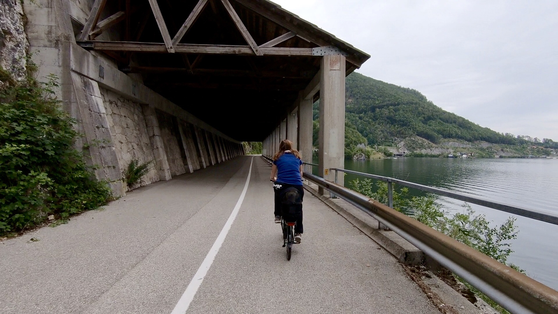Man cyklade utanför biltunneln, utmed vattnet – antagligen den gamla vägen, innan tunneln var byggd! Inte kul att få möte med en lastbil här 🙈.