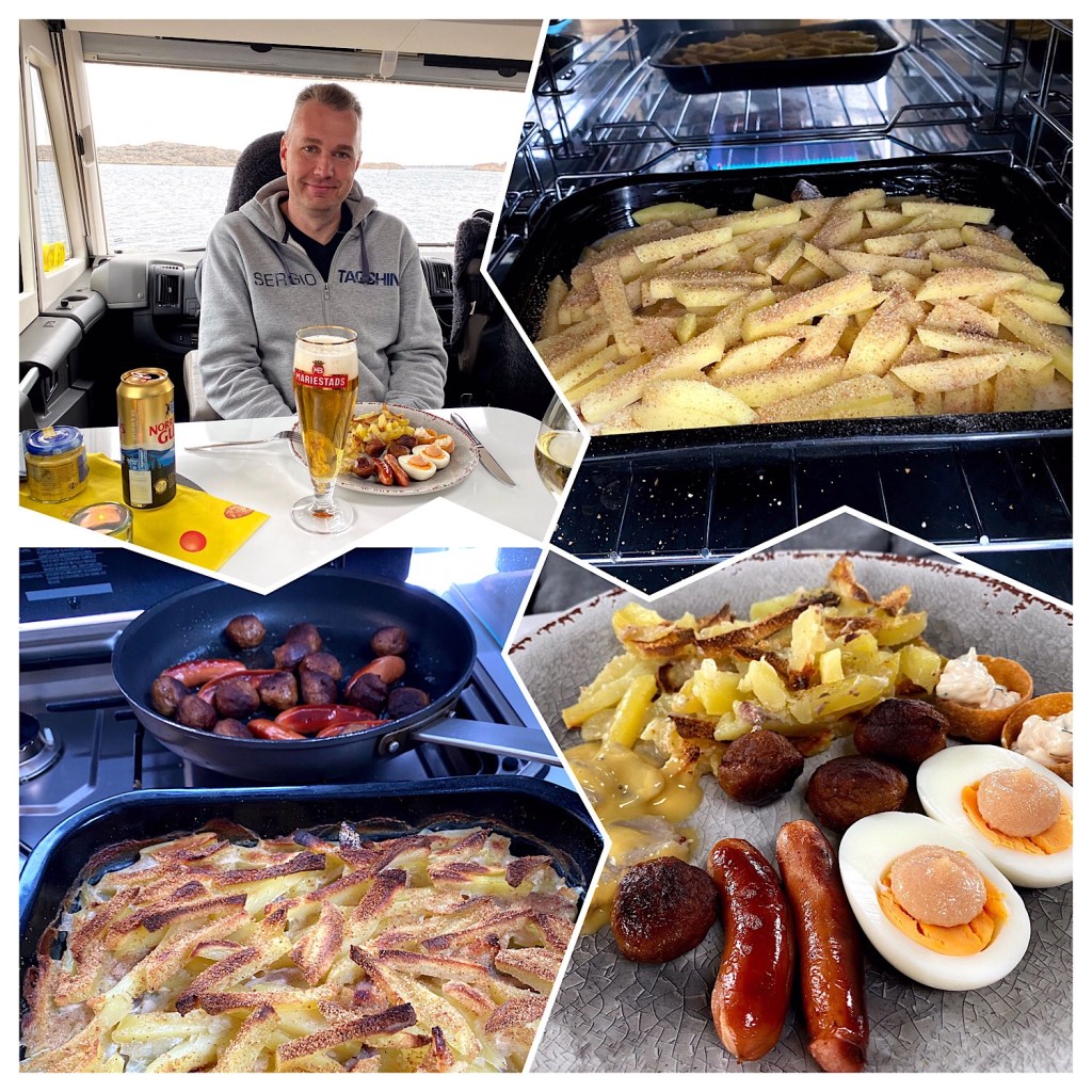 Vilken cool ställplats!!! Vädret däremot är inte så bra som igår, (då blev näsan min röd i solen 🙈), men det gör inte så mycket för nu var det dags att göra lite påskmat 🐣.