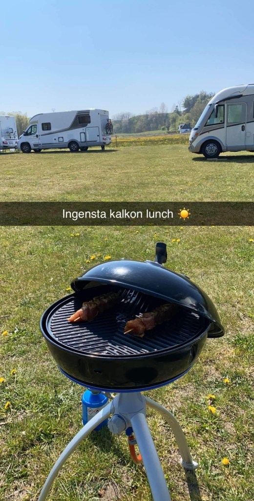 Vi parkerade på ställplatsen (gratis dagtid) och grillade kalkonspetten jag köpt på Ingelsta.