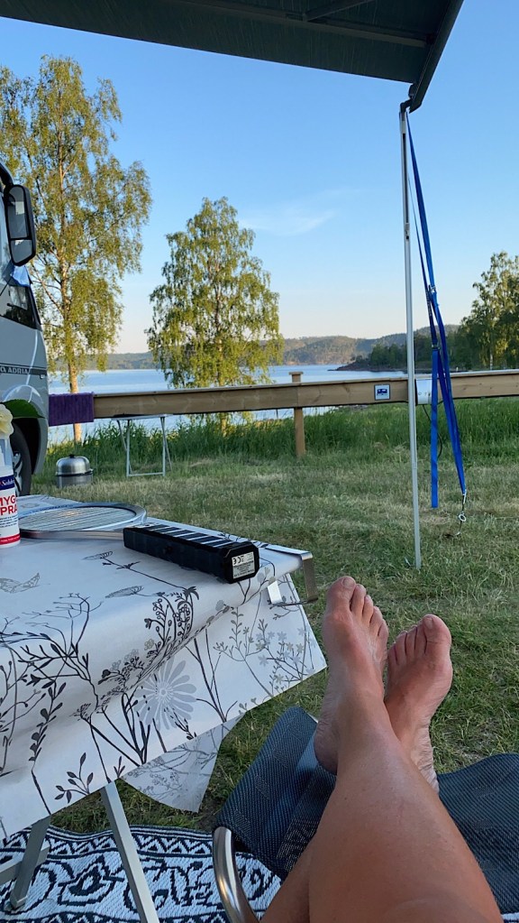 Vi installerade oss på en plats med fantastisk utsikt, ja det hade faktiskt alla campingens 12 platser!!!😍 Både solskyddet till framrutan och markisen kom fram!!! Det var riktigt varmt! Termometern visade på 29 grader i skuggan 🥵.