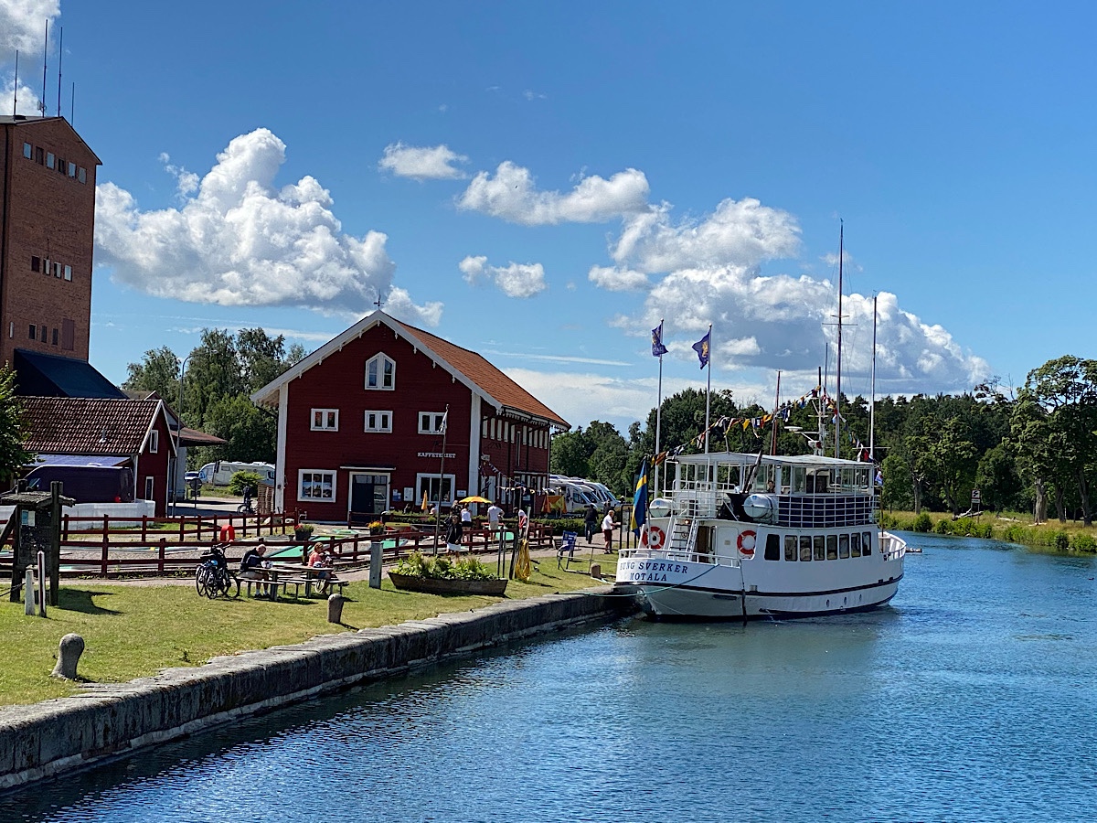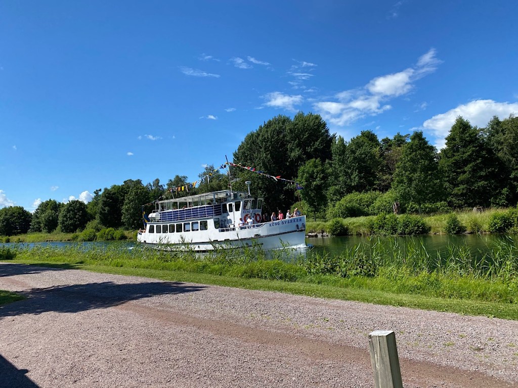 Efter att ha bytt plats, från en med el och nära servicehus (en plats det dessutom var huggsexa på!) flyttade vi oss till plats 27 – utan el och ”långt” till servicehus, MEN med ett fantastiskt läge längs kanalen – helt suveränt!! 🤩 Vi veliga?? Å inte! 😂
