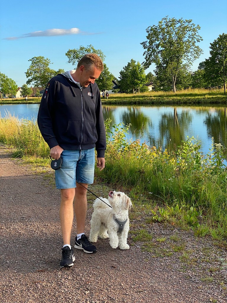 Vi gick på eftermiddagen en tur med Binkan mot nästa bro, (över och tillbaka igen, var tanken), vi hann inte mer än till bron!!! Det började brumma… 🌩 och regnmolnen närmade sig snabbt! Det blev till att krypa in ett par timmar. Framåt kvällen klarnade det upp igen ☀️ och vi kunde gå vår tilltänkta runda 😜