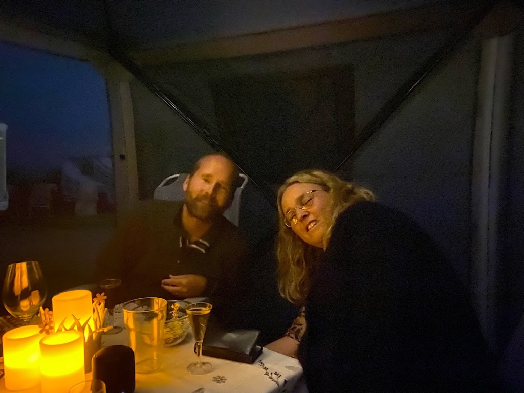 Vi hamnade istället i vårt tält – med alla fyra väggarna uppe och med Rogers värmelampa så frös vi inte i första taget 😝