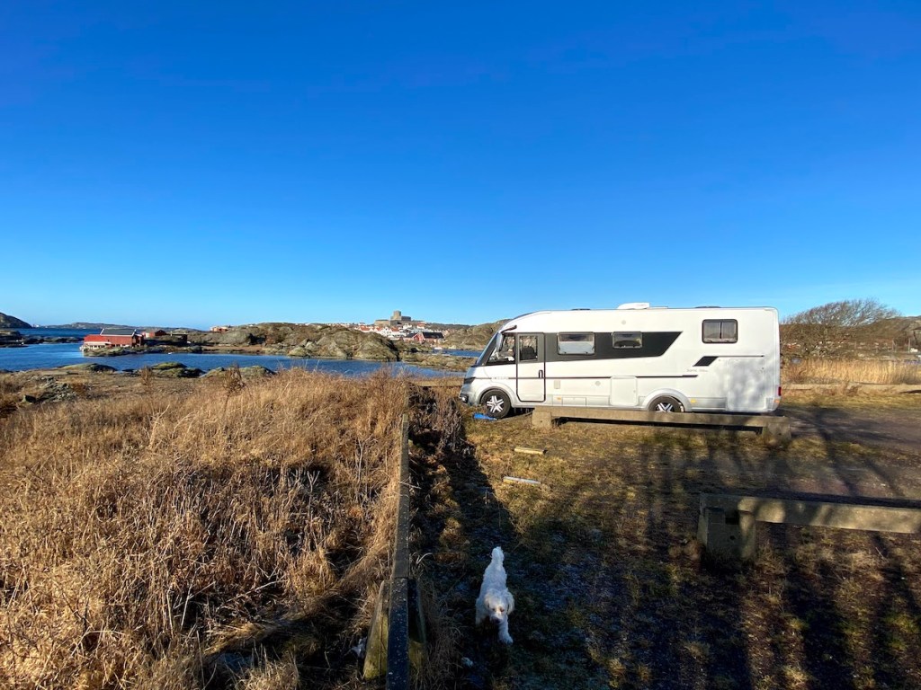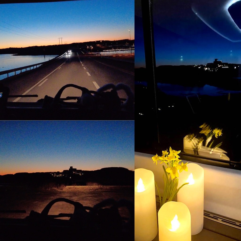 Härligt att dagarna blivit lite längre! Det räckte dock inte riktigt, för framme i Marstrand var vi inte förrän solen gått ner. Vi brukar gissa hur många bilar där ska stå, Micke gissade 10 jag 5, båda gissade rätt fel – vi var helt ensamma😂