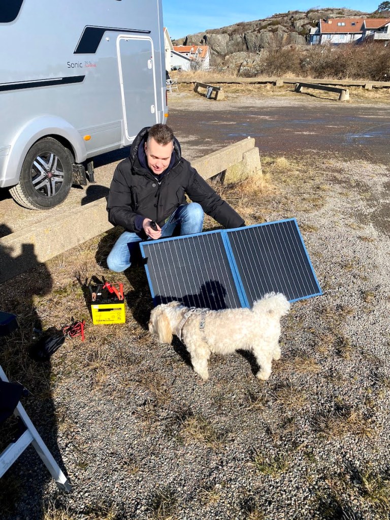 Tillbaka vid husbilen skulle då äntligen Micke göra sin solcells-Youtubefilm, där han testar en ny billigare och lättare variant jämfört med den vi hade tidigare….