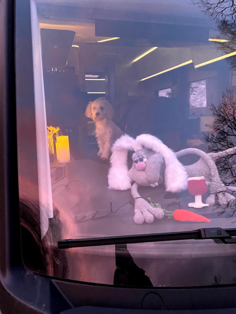 Bingo måste ju ha koll på var alla är – flocken ska vara samlad! Går man ut och grillar far han runt i husbilen från fönster till fönster för att se vart man tog vägen 🤣.
