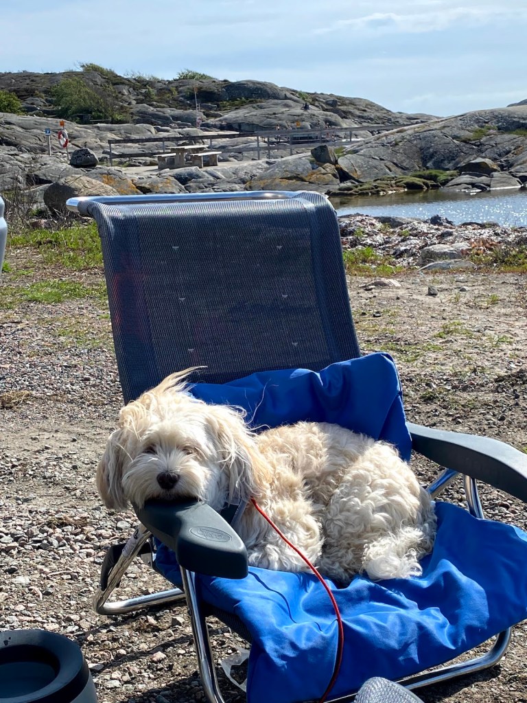 Eftersom han inte har hjärta att flytta på honom tog han pallen 😂, men Binkan gjorde ingen ansats att flytta sig på ett bra tag, så det vara bara att ta fram en stol till 😃.