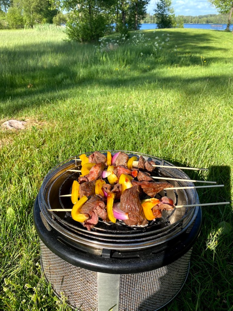 Till kvällen hade jag förberett grillspett. Hemma hade jag sousvidat högrev i bitar som jag nu gjort grillspett av, meeeeen det blir inte så bra som jag tänkt mig! Tyckte köttet var segt. Får nog fila på graderna och tiden till nästa gång! 🧐