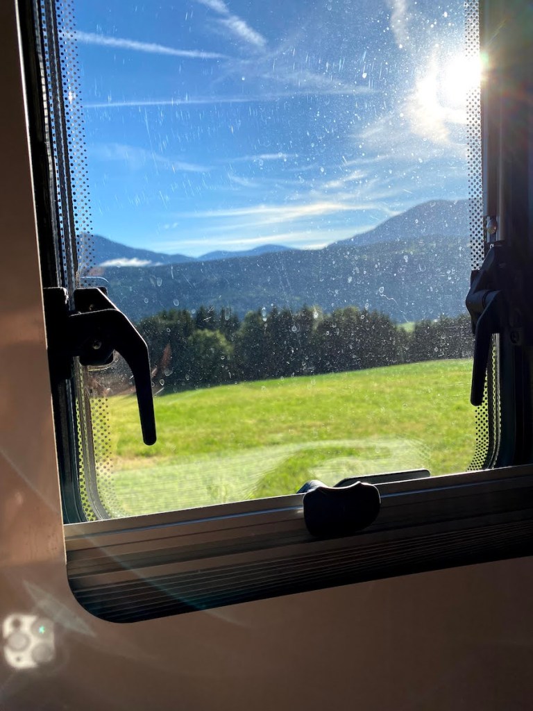 På morgonen 7:45 kom den tutande brödbilen infarandes 🤣. Det var lite kyligt så frukost ute var det inte tal om, sen ville vi ju snabbt iväg. Och snabbt i väg kom vi! 9:00 rullade vi ut från ställplatsen och satte siktet mot Österrike.