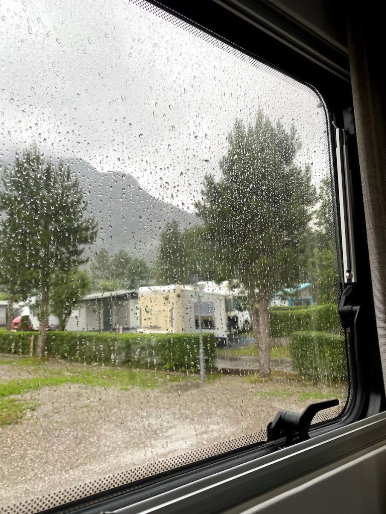 Tillbaka vid husbilen hade det blivit så pass bra väder att vi kunde sätta oss ute en stund och gotta oss – rätt cool utsikt🤩!