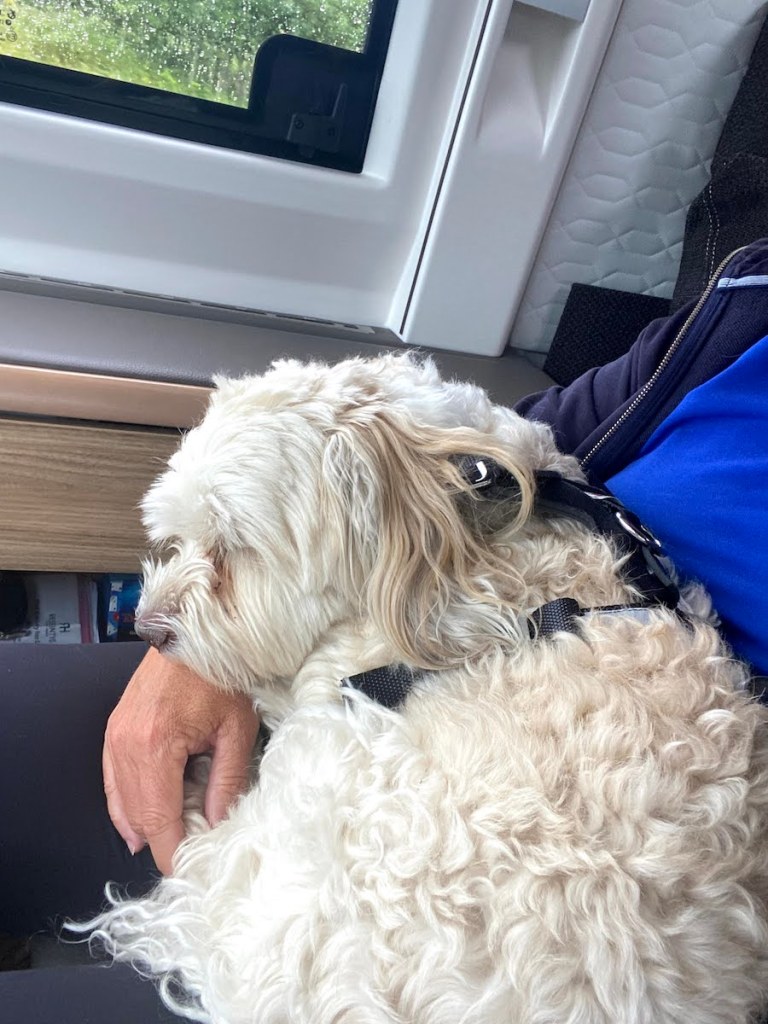 Binkan tycker fåssan kör dåligt! Det hoppar och guppar och svänger! Då vill han ligga i knät 🥰