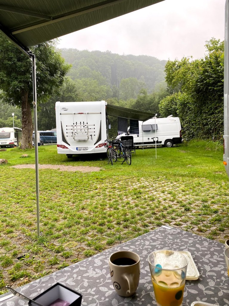 Meeeen glömde en sak!!! Räkna inte med att sova längre än till kl 7 på vare sig denna eller granncampingen i byn!!!!!!! Kyrkan som ligger precis bredvid väsnas varje kvart! 1 slag kvart över, två slag halv, tre slag kvart i och en vääääääääldig massa slag kl 7 på morgonen (inga 7 slag – nej nej nej en biljard!!!!!) Inga öronproppar i världen hjälpe mot det!!!! Men, men man kom ju upp i tid i alla fall 🤣
