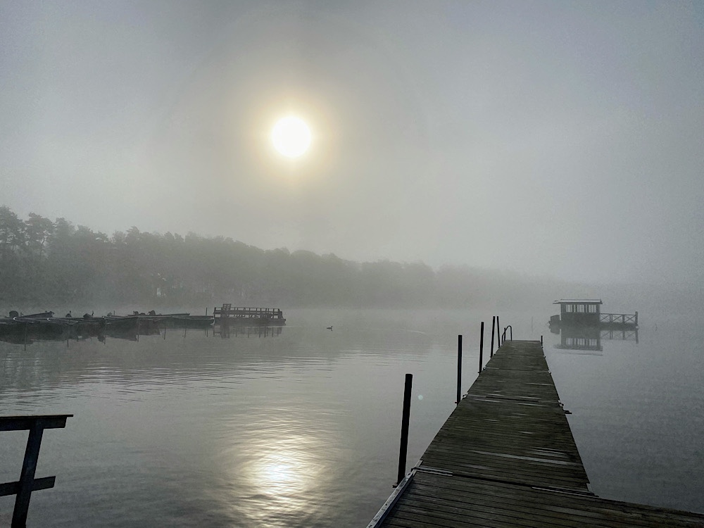 På söndagsmorgonen låg dimman tät! Vi gick en runda med Binkan innan vi åt frukost och for hemåt.
