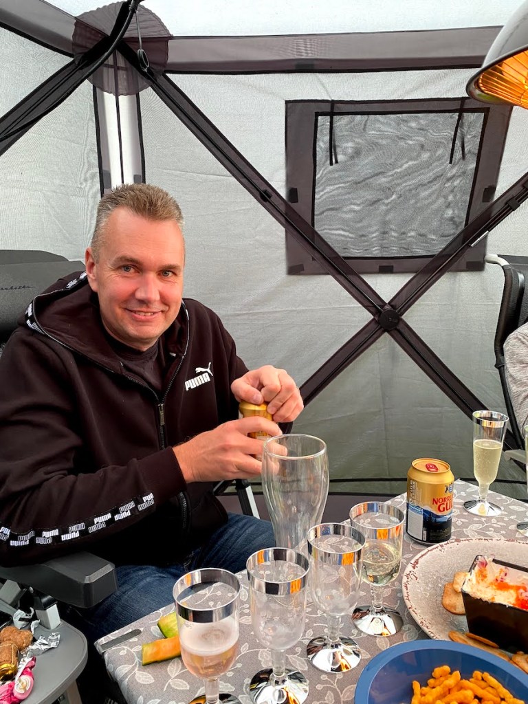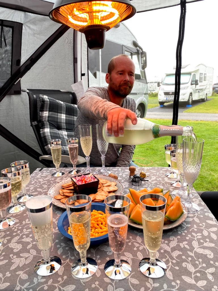 Lena och Roger som också bokat plats på Apelvikens camping var inte sena med att haka på! Vi köpte två flaskor bubbel och de köpte två 🤪🥂🍾