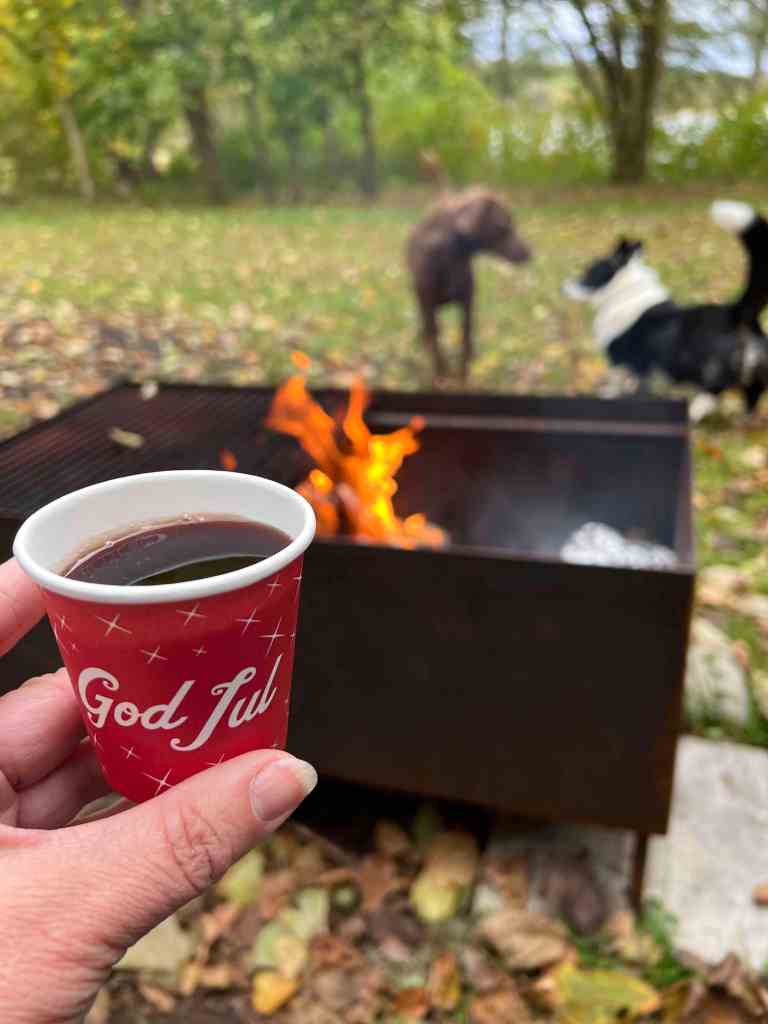 Där fanns också en eldstad med ved i ett litet skjul, så vi satte igång en brasa. Eva hämtade en gryta och en flaska glögg – alltså jag bara 😍😍😍