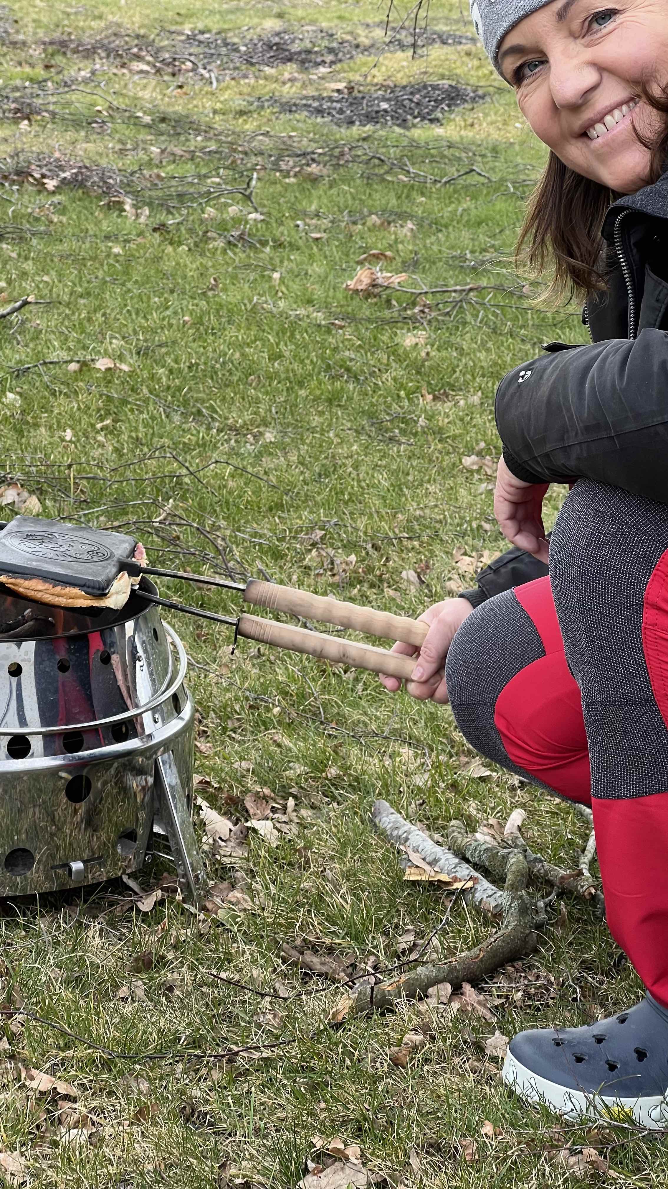 Tillbaka vid husabilen igen var det dags att brassa lite käk. Jag hittade en bit av julskinkan i frysen häromdagen och tänkte den passade bra i varma mackor i vårt nya våffeljärn 🤤.